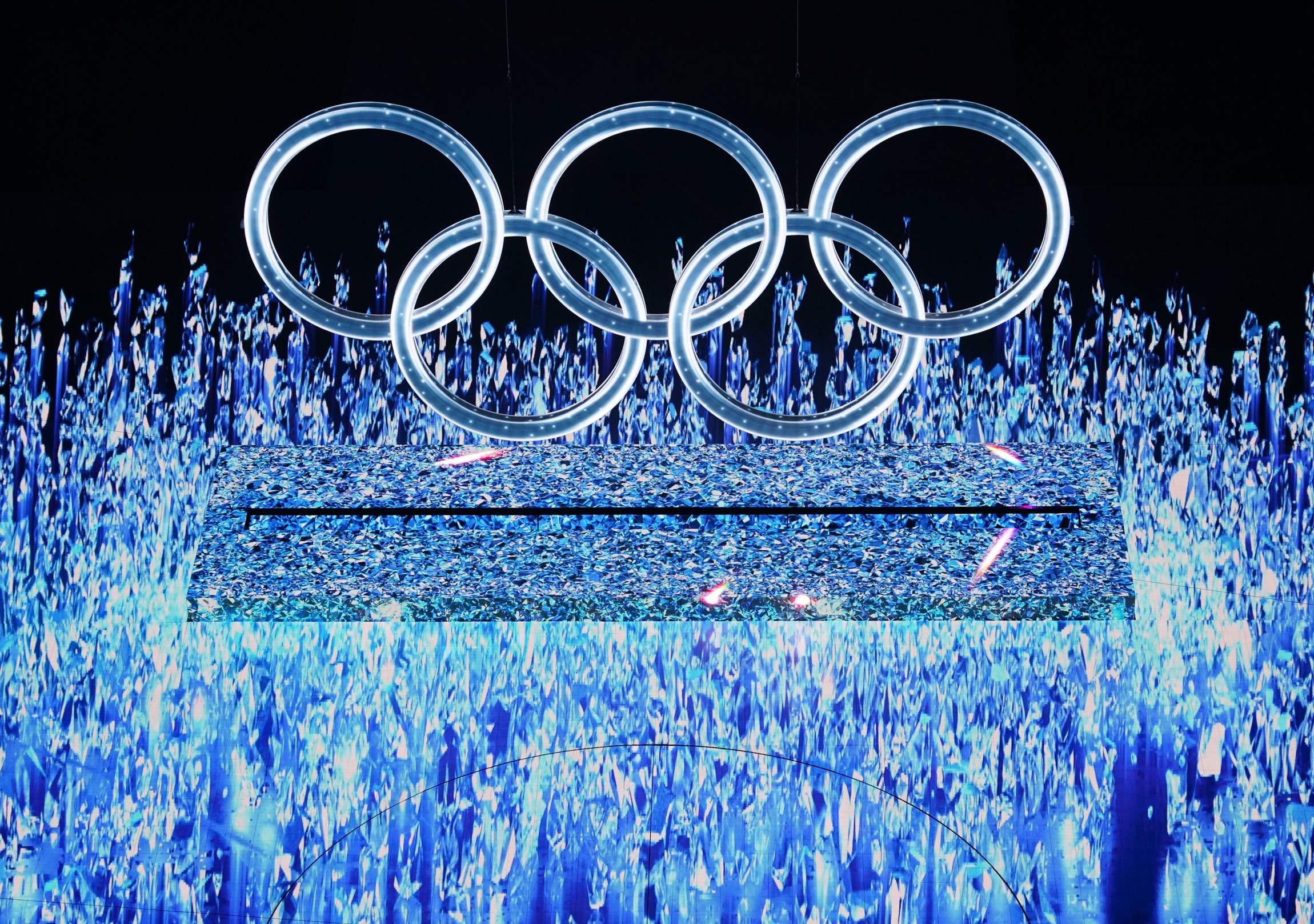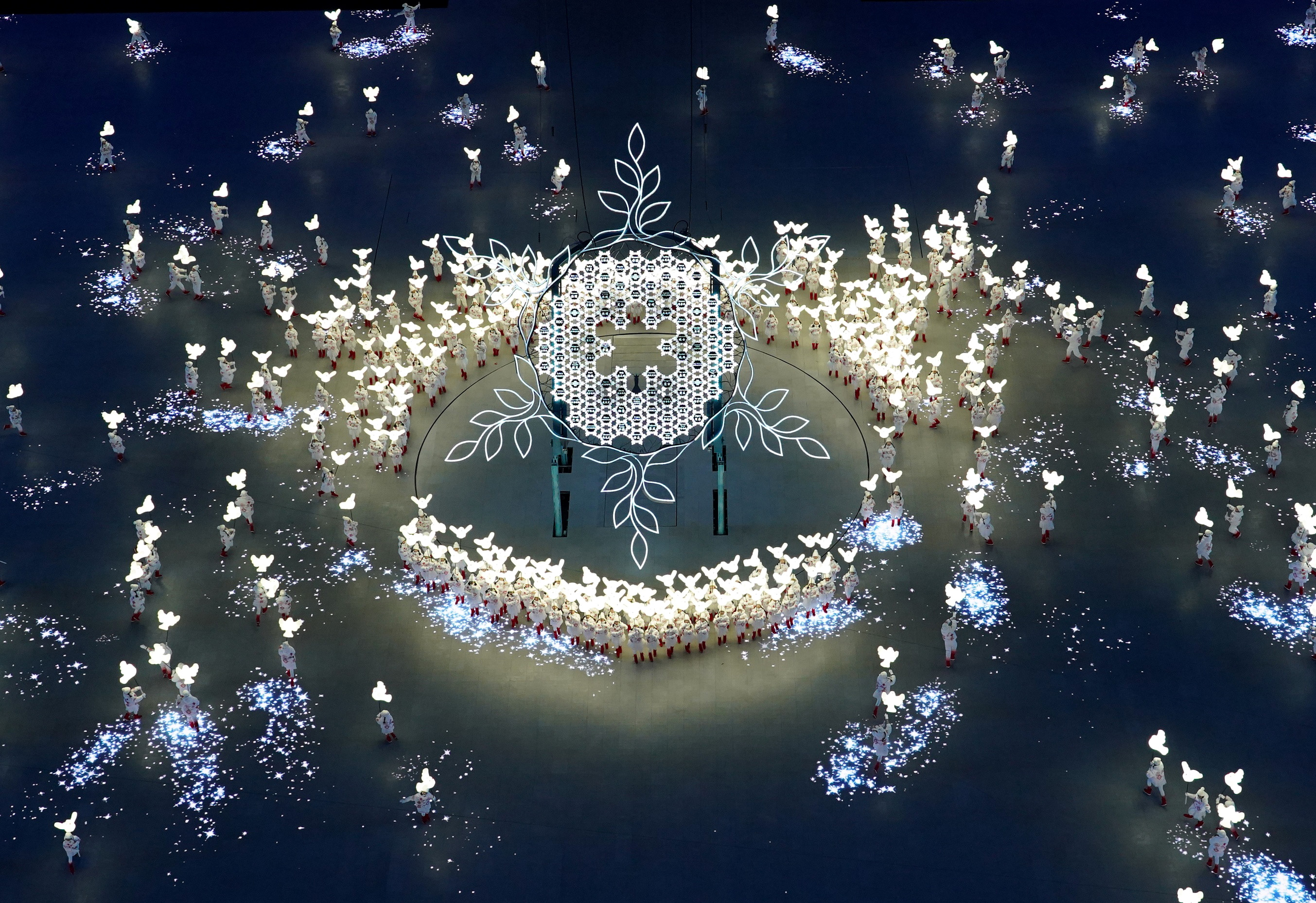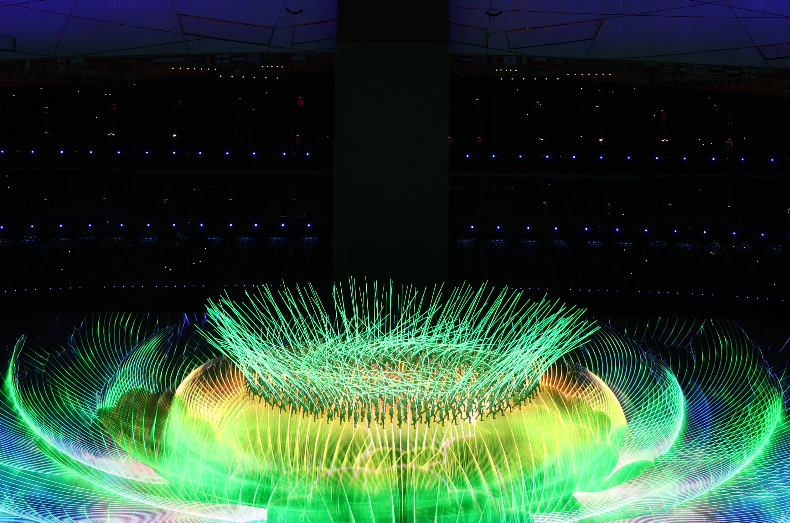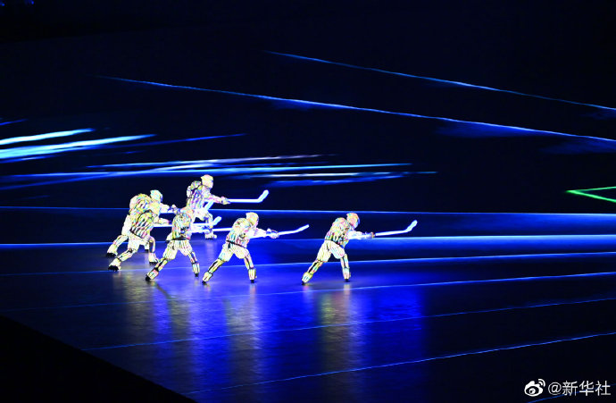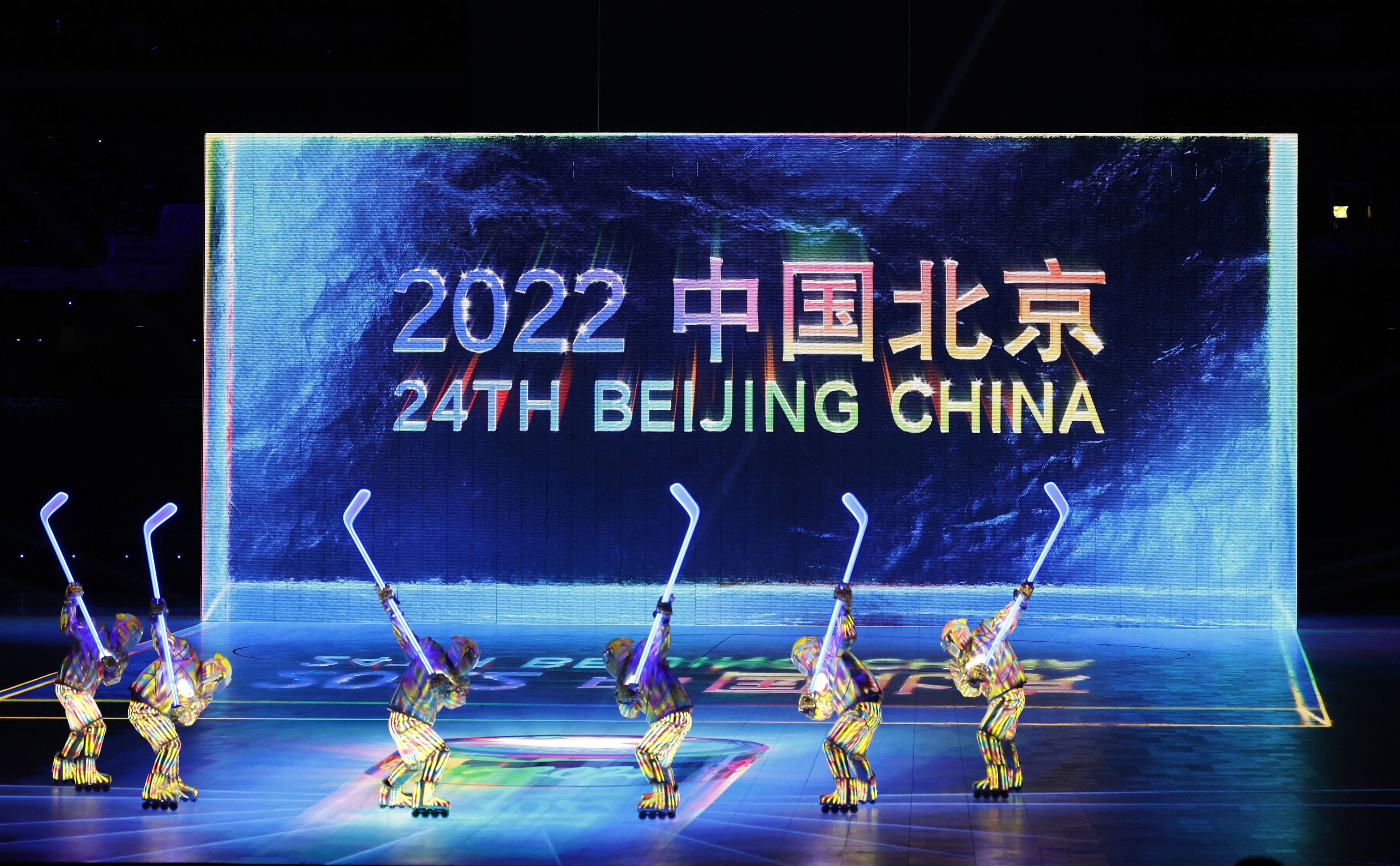展示整个冬奥会的历史。一方巨大的水从冰面中升起,凝固成冰。过往23届冬奥举办城市的历史,随着环绕全场的24道“激光刻刀”的雕琢,闪回其上,最终定格为“2022中国北京”。