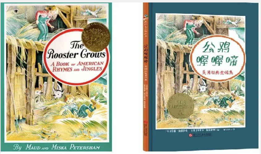 所谓“三国童谣”,在这里大致是指中、英、美三国已籍成“经典”的童谣。说是“大致”,主要是因为虽然“鹅妈妈童谣”的成书版本最早可追溯至1760年英国书商约翰·纽伯瑞出版的《鹅妈妈的旋律或摇篮曲》(已散轶),但其异文变体却遍布欧洲大陆。就连我们今天讨论的“起点”、美国童谣集绘本《公鸡喔喔啼》中也有不少同题篇目,如《围着玫瑰转圈圈》《扬基歌》《杰克·霍纳》《豌豆粥》《杰克和吉尔》《小玛菲特小姐》《矮胖子达姆普蒂》,等等。