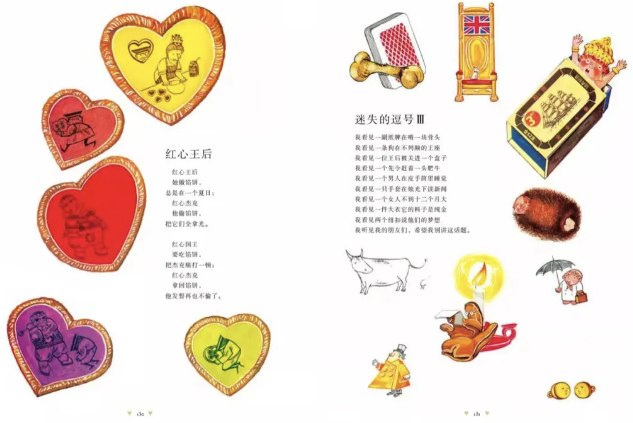 中国古代有回文诗,文人常以此炫技或游戏,比如著名的“赏花归去马如飞”。上面这首《迷失的逗号 I》可以说是英文版的“叠字回文诗”,或者我们可以像玛格丽特·阿特伍德那样叫它“诡计诗”(a trick poem)。像这样曲折环复的诡计诗也更像是文人琢磨文字后的设计而不像是民间天然生成。然而,《威斯敏斯特闹剧》是被归入“民谣”书籍类的选集;19世纪的时候它已是女孩们日常文字游戏时的“道具”;在当代,雷蒙德·伯里格斯也将其收入了《鹅妈妈童谣金典》里。凡此种种,似乎可以说明至少在英国,对童谣的创作者/来源身份的规定并不那么严苛,只要孩子们愿意接受,即使其遣词造句比民间口头文学要文雅复杂一些,也完全可能被收入“鹅妈妈童谣”这样我们一般认为是收录“正宗民间口头文学”的文集里。不论是朱介凡收集的《中国儿歌》(朱介凡在序言中确实解释过何以将书命名为“中国儿歌”而不选用“童谣”一词,最主要的一点是他定义下的童谣重在政治性,少与儿童生活相关),抑或出版于1996年的郁宁远从全国征集到的数千首童谣中选编的《中国童谣》,还是新近出版的较系统全面的《中国传统童谣书系》或市场反应相对较好、各类以“老童谣”为关键词命名的童谣集,编选者似乎都将目光集中在单一体现语言浅显、文意与结构单纯、方言特征较浓的短作品上。我想,这很可能是造成我们的“童谣”难以成为深层精神给养的原因之一,一味追求浅显直白易于理解,对浅语背后是否承载值得反刍的意蕴却缺乏要求。我们一再说好的儿童文学是“浅语的艺术”,并非只有“浅语”而无“艺术”。