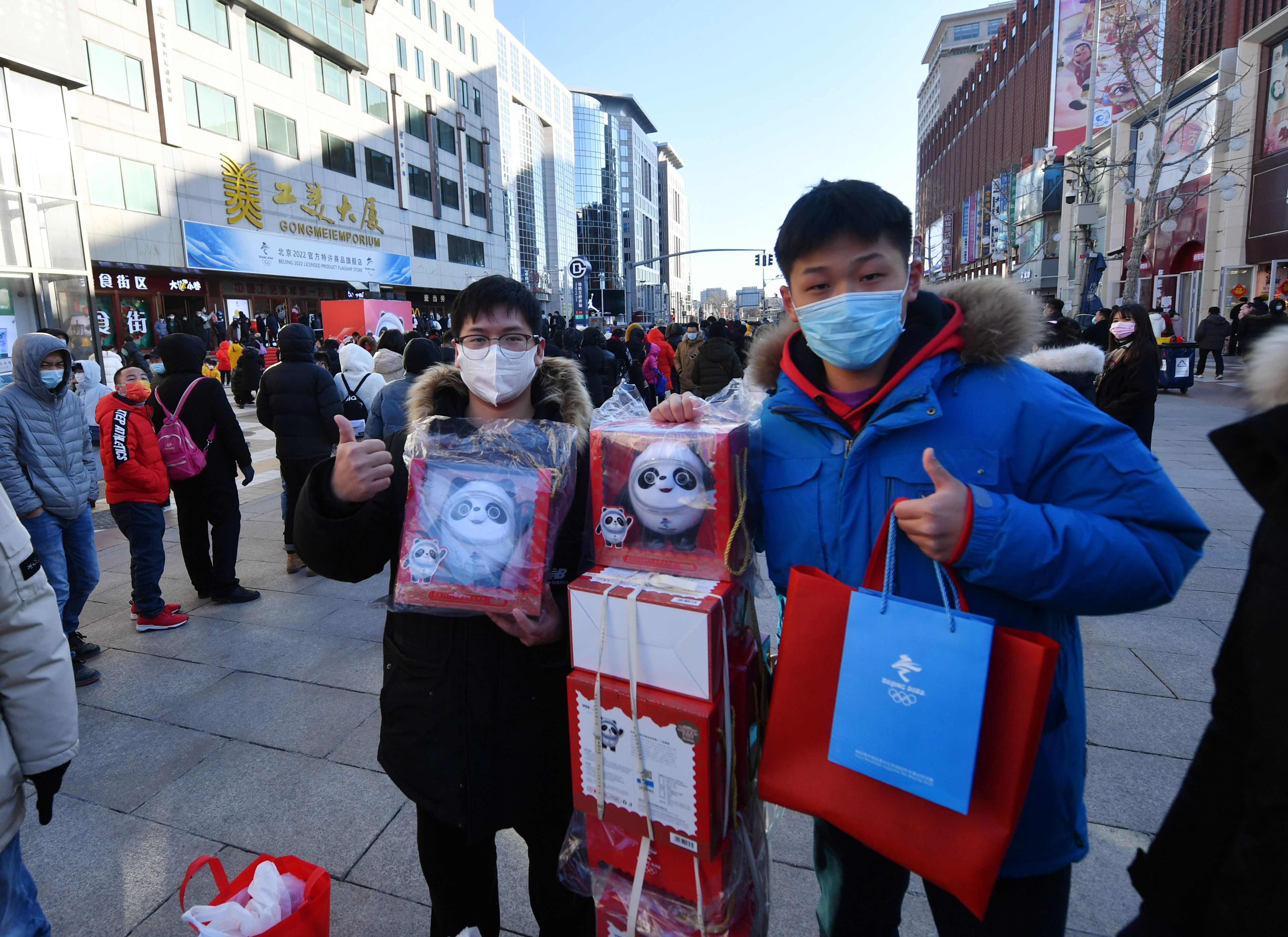 ▲2月4日下午,北京王府井工美大厦“北京2022官方特许商品旗舰店”门外,两位市民展示购入的冬奥特许商品。新京报记者 王贵彬 摄