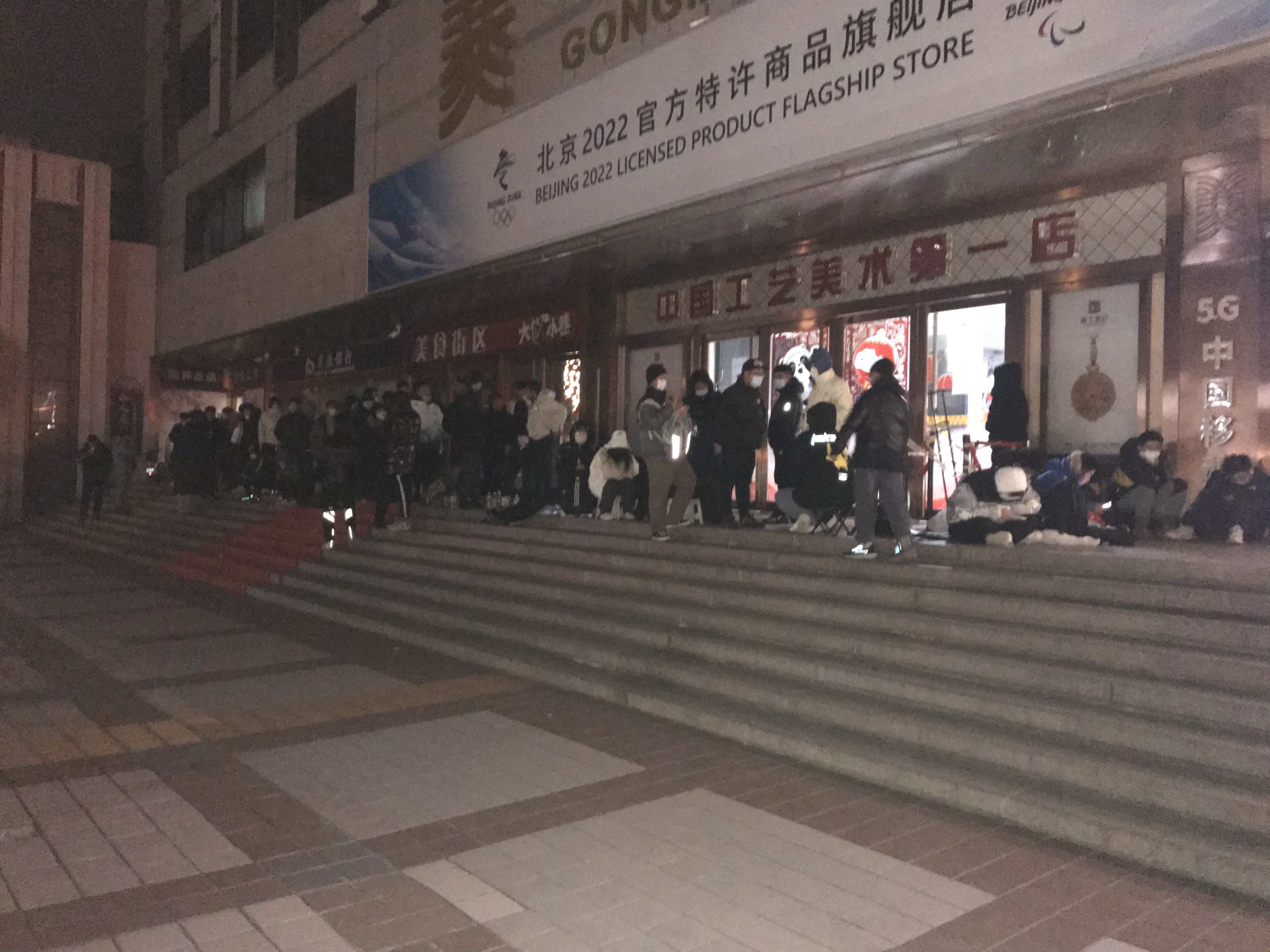 ▲2月5日晚11点,北京2022官方特许商品旗舰店门外的长队。新京报实习生 丛之翔 摄