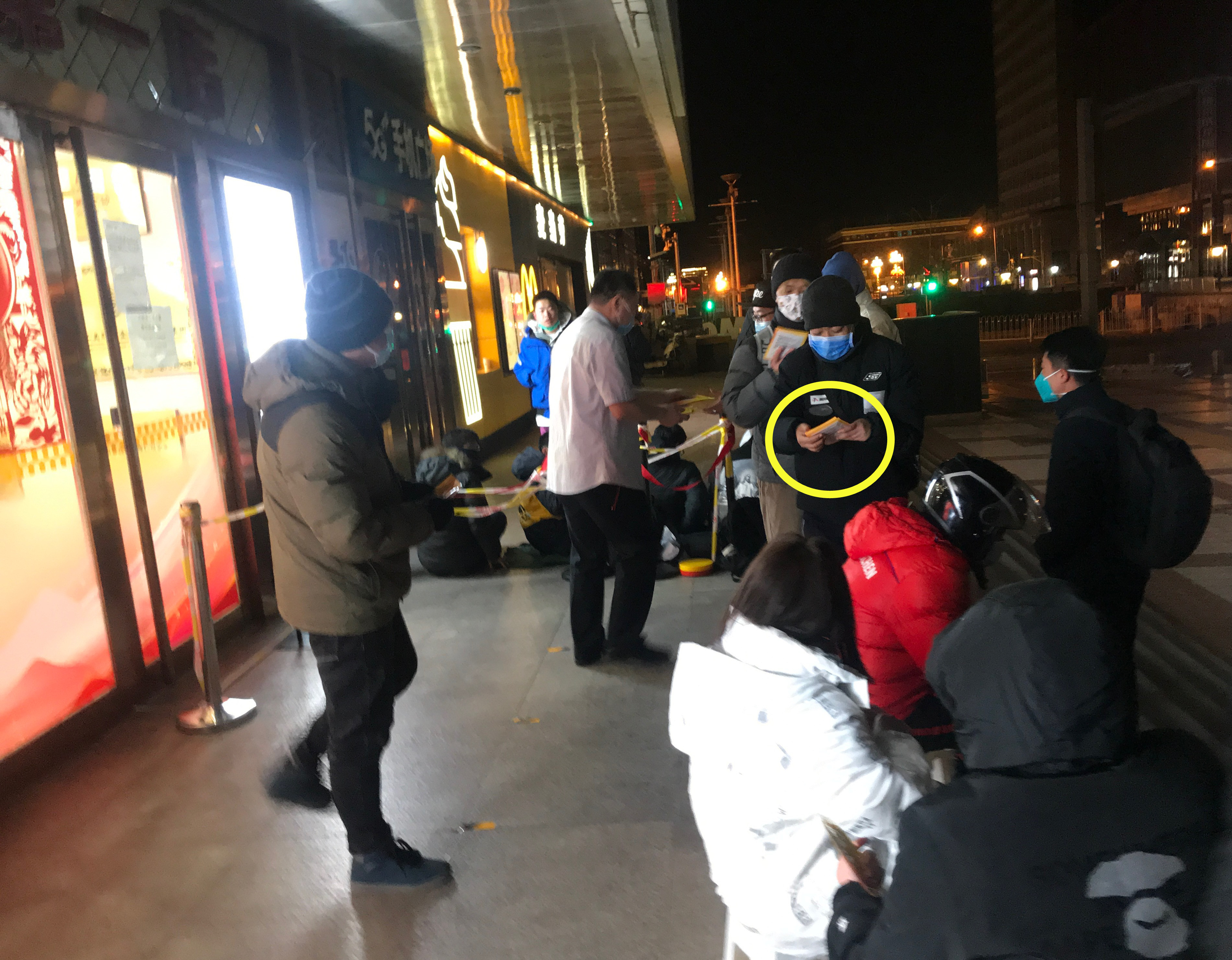 ▲2月5日晚11点多,旗舰店工作人员向排队者免费发放暖宝宝贴。新京报实习生 丛之翔 摄