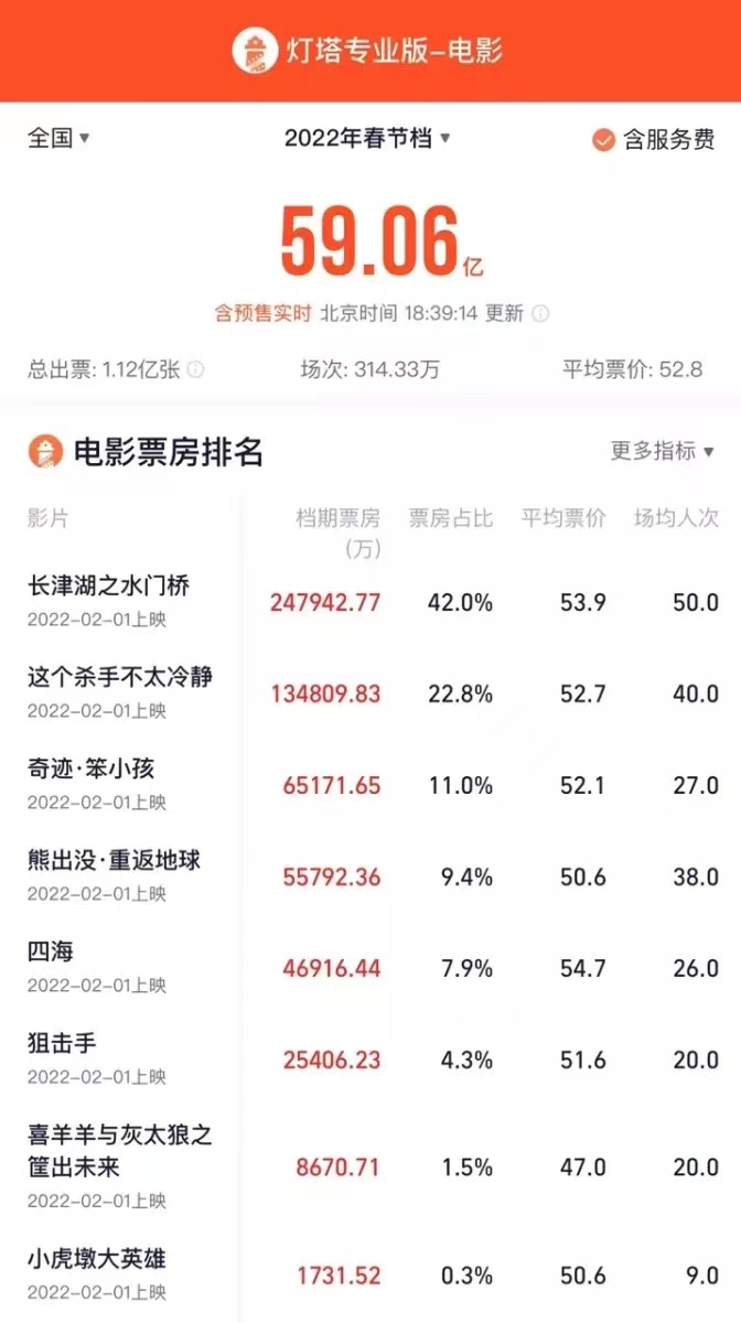 2022春节档票房59.06亿,位列中国影史春节档第二