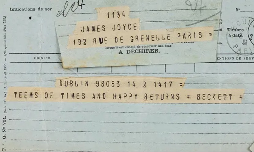 贝克特是著名小说《等待戈多》的作者。在这封电报中,贝克特祝福他:“岁月流逝,快乐归来。(Teems of times and happy returns.)”除了这封电报外,乔伊斯的孙子斯蒂芬·詹姆斯·乔伊斯(Stephen James Joyce)和他的妻子索兰奇(Solange)还捐赠给雷丁大学许多文件,其中包括斯蒂芬·詹姆斯·乔伊斯和他的妻子在婚礼上的照片,贝克特还是他的伴郎。这次捐赠是为了纪念具有开创性的小说《尤利西斯》出版一百周年,以及乔伊斯诞辰140周年。