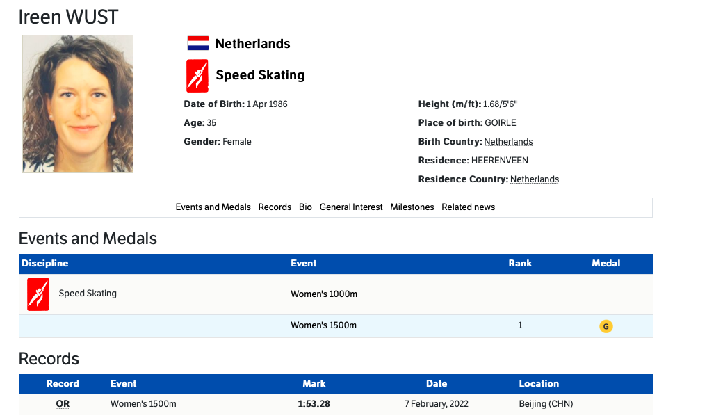 作为冬奥会历史上成就最高的女子速滑选手,荷兰名将维斯特第5次征战冬奥会,此前4届冬奥会,维斯特获得5金、5银、1铜。女子1500米项目上,维斯特是都灵冬奥会季军、温哥华冬奥会冠军、索契冬奥会亚军、平昌冬奥会冠军。