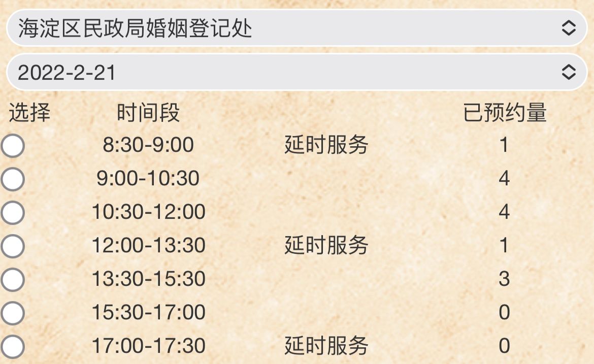 2020年9月起,北京推出政务“延时服务”,工作日除早晚提供半小时延时服务外,取消工作人员午休时间,周六延时工作一天。目前,全市婚登服务从8时30分持续至17时30分,全天分为7个预约时段。截至记者发稿时,东城、西城、朝阳、海淀、顺义、大兴等多区仅剩两个时段还可预约。