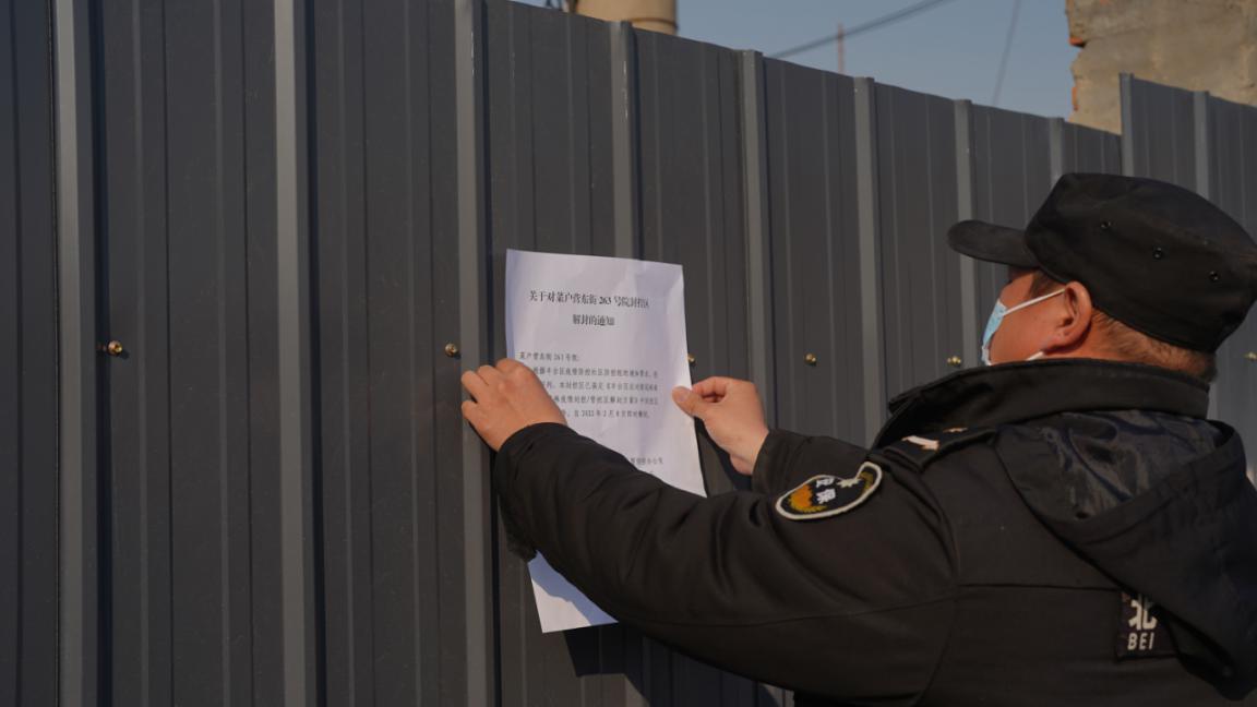 2月9日9时许,右安门街道对菜户营东街263号院封控区张贴解封通知。右安门街道供图