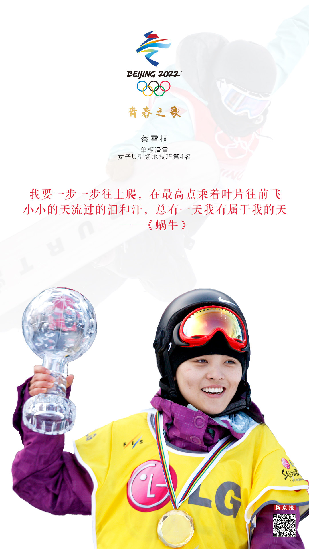 在“半拉管子里飞来飞去”的时候,蔡雪桐展示出了天赋,得到“天才少女”的赞誉。从2008年首次参加正式比赛就夺得全运会铜牌,到2009年摘下国际雪联世界青年单板滑雪锦标赛的女子U型场地金牌,“天才少女”的荣誉之路有着不错的开始。十余年来,大大小小的冠军被她拿到手软,其中最具含金量的当然是两次世锦赛冠军和七次世界杯总冠军。然而这些荣誉里,好像缺了点什么。