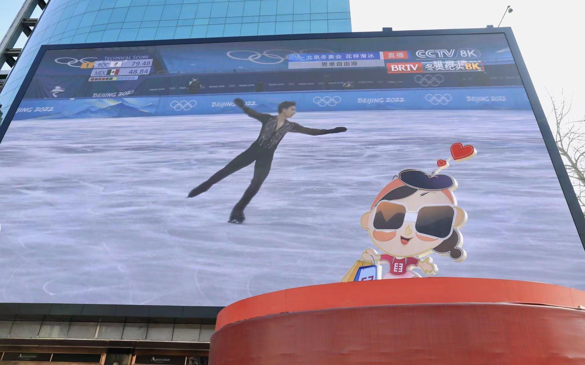 新京报讯(记者 吴为)2月10日,在北京市海淀区当代商城楼宇外侧,全市最大的一块8K城市公共空间大屏正在播放北京冬奥会的比赛。往来的市民驻足观看。