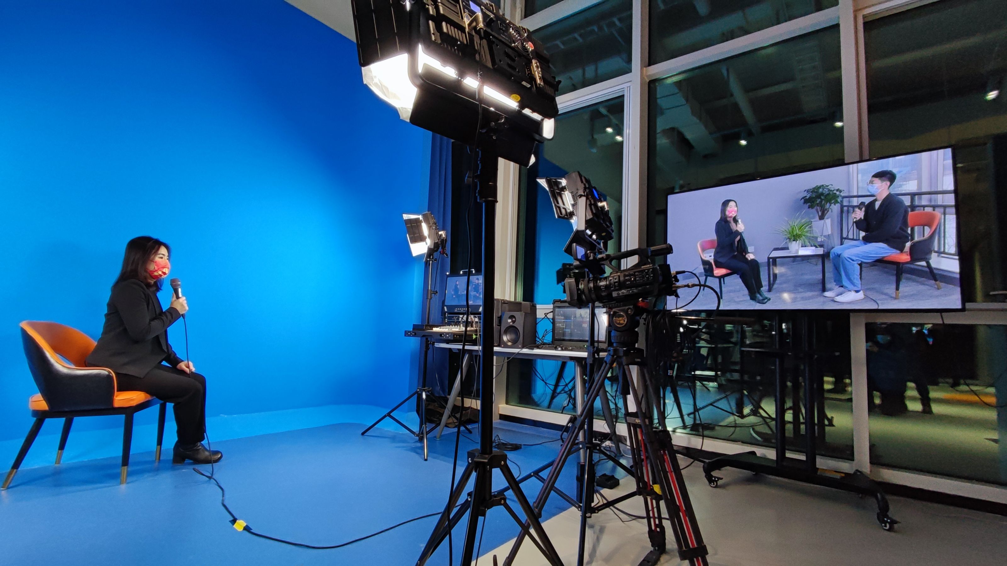 ▲演播室内,工作人员演示远程无人混合采访。新京报记者 陶冉 摄