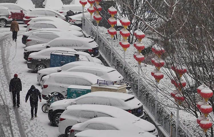 2月13日,北京迎虎年头一场降雪。正值冬奥会举办期间,京城一片白雪皑皑,银装素裹的双奥之城变得美不胜收。北京市气象台发布暴雪蓝色预警、大雾黄色预警、道路结冰黄色预警。图为:东四十条,小区内车辆盖上厚厚的白雪。