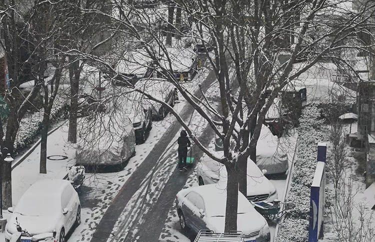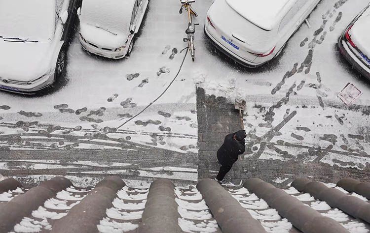 东四十条的中式屋檐下,市民正在清理路面积雪。