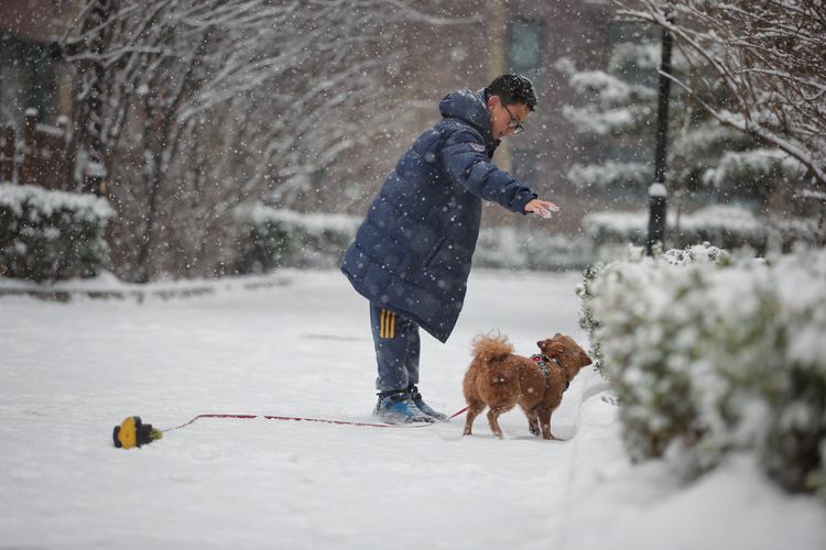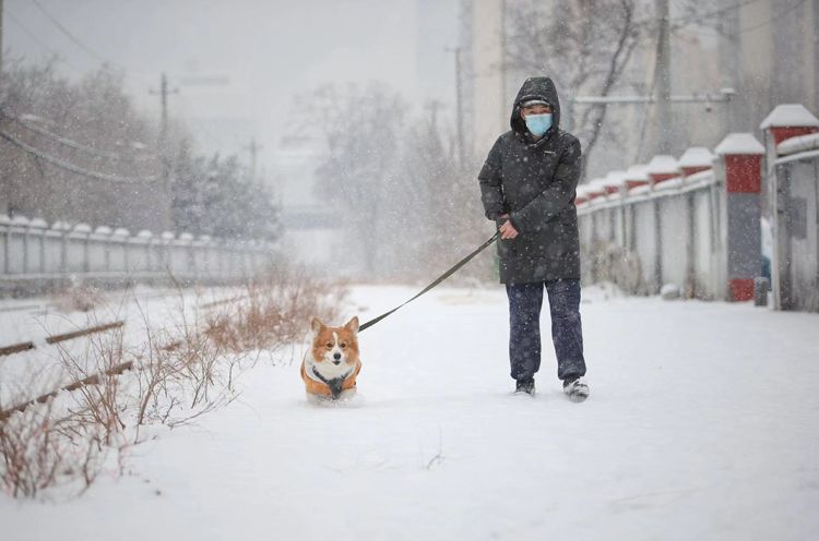2月13日,四惠,市民牵着小狗欣赏雪景。