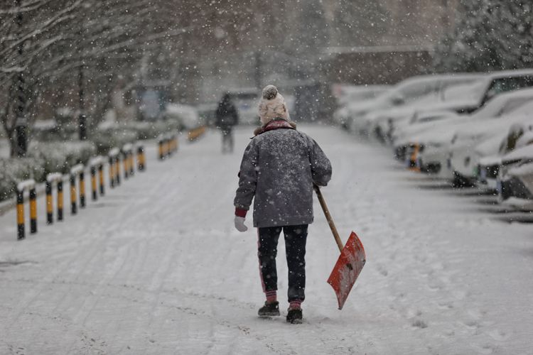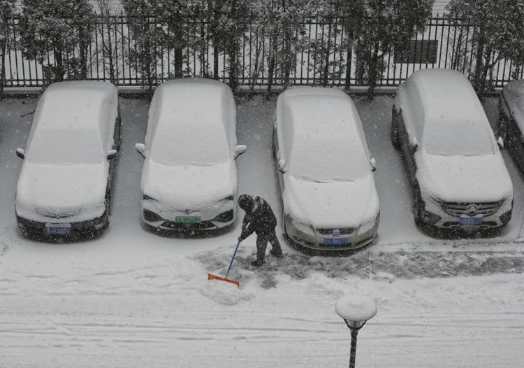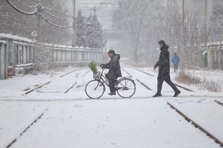 2月13日,北京迎虎年头一场降雪。正值冬奥会举办期间,京城一片白雪皑皑,银装素裹的双奥之城变得美不胜收。北京市气象台发布暴雪蓝色预警、大雾黄色预警、道路结冰黄色预警。图为朝阳区四惠一小区,工作人员一早就开始清扫小区内积雪。