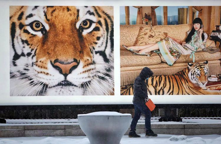 2月13日,大望路,市民走过巨幅广告牌,这是北京虎年的首场雪。