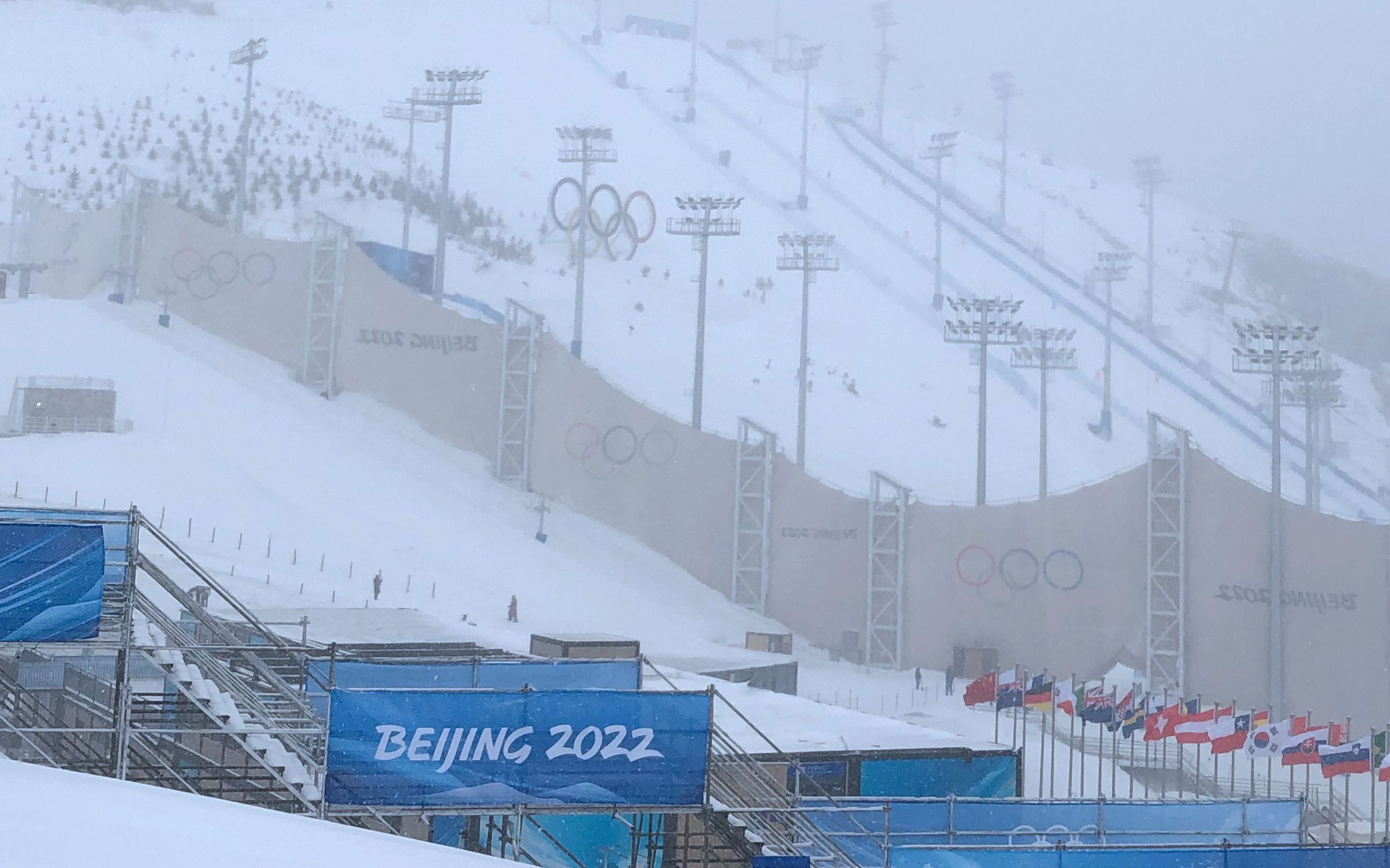 2月12日,张家口赛区迎来了冬奥会期间的首场降雪,且形成连续降雪。13日一早,记者冒雪赶到云顶滑雪公园时,雪势尚不甚大,参赛选手们也如期参加了赛前训练。然而随着时间推移,风雪越来越大,坡面障碍技巧场地旁边的U型场地已被厚厚的积雪覆盖,几乎看不出这就是蔡雪桐所形容的“半拉管子”。比赛开始前70分钟左右,官方宣布自由式滑雪女子坡面障碍技巧资格赛推迟至中午12时进行。