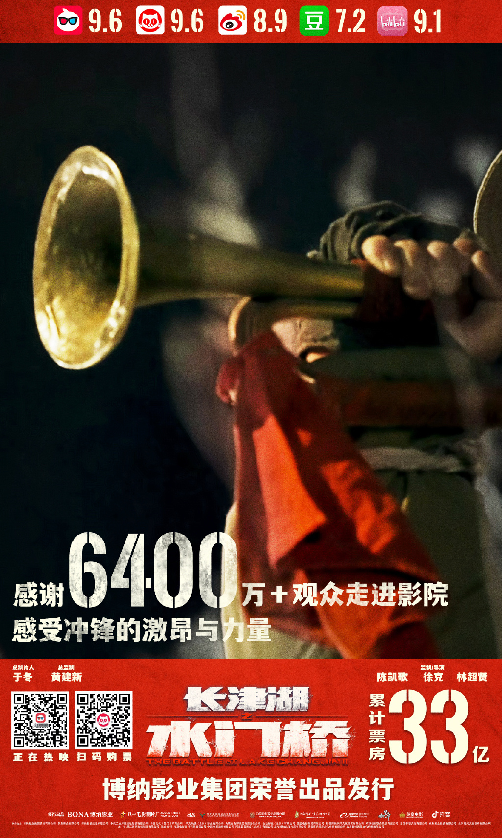 新京报讯 2月13日,电影《长津湖之水门桥》累计票房突破33亿元。官方微博配文称:“感谢6400万观众走进影院,共同感受冲锋的激昂与力量!”