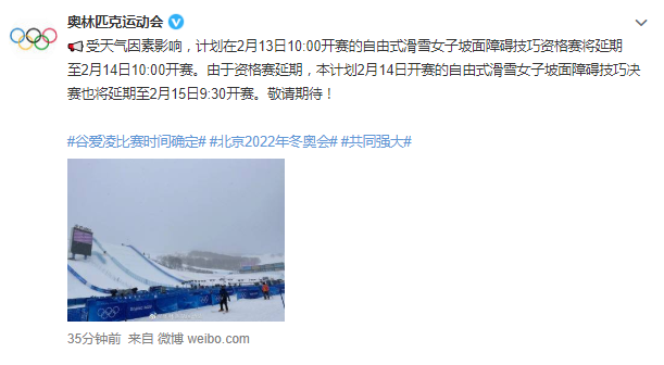 据国际奥委会官方微博消息,受天气因素影响,计划在2月13日10:00开赛的自由式滑雪女子坡面障碍技巧资格赛将延期至2月14日10:00开赛。由于资格赛延期,本计划2月14日开赛的自由式滑雪女子坡面障碍技巧决赛也将延期至2月15日9:30开赛。谷爱凌在张家口赛区的首秀也因此推迟。