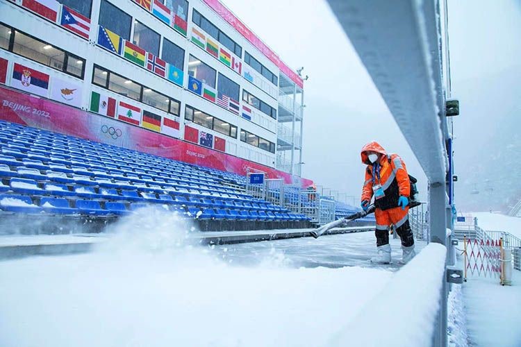 所以赛场飘雪后,工作人员会立刻清理赛道上的浮雪,能保证赛事正常进行,降低运动员受伤的概率。