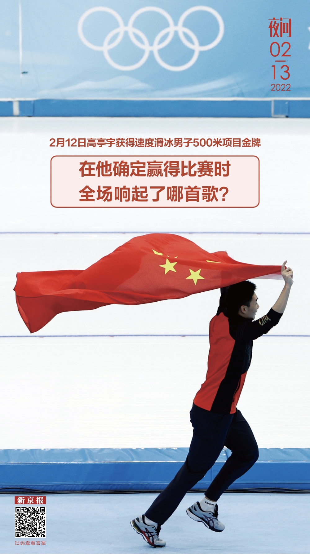 2月12日傍晚,速度滑冰男子500米比赛在国家速滑馆“冰丝带”结束,第7组登场的中国选手高亭宇滑出34秒32,刷新奥运会纪录,最终夺得金牌。在所有选手比完后,现场响起了《我爱你中国》,在音乐声中,高亭宇举着国旗绕着比赛场地滑行,释放着激动心情。