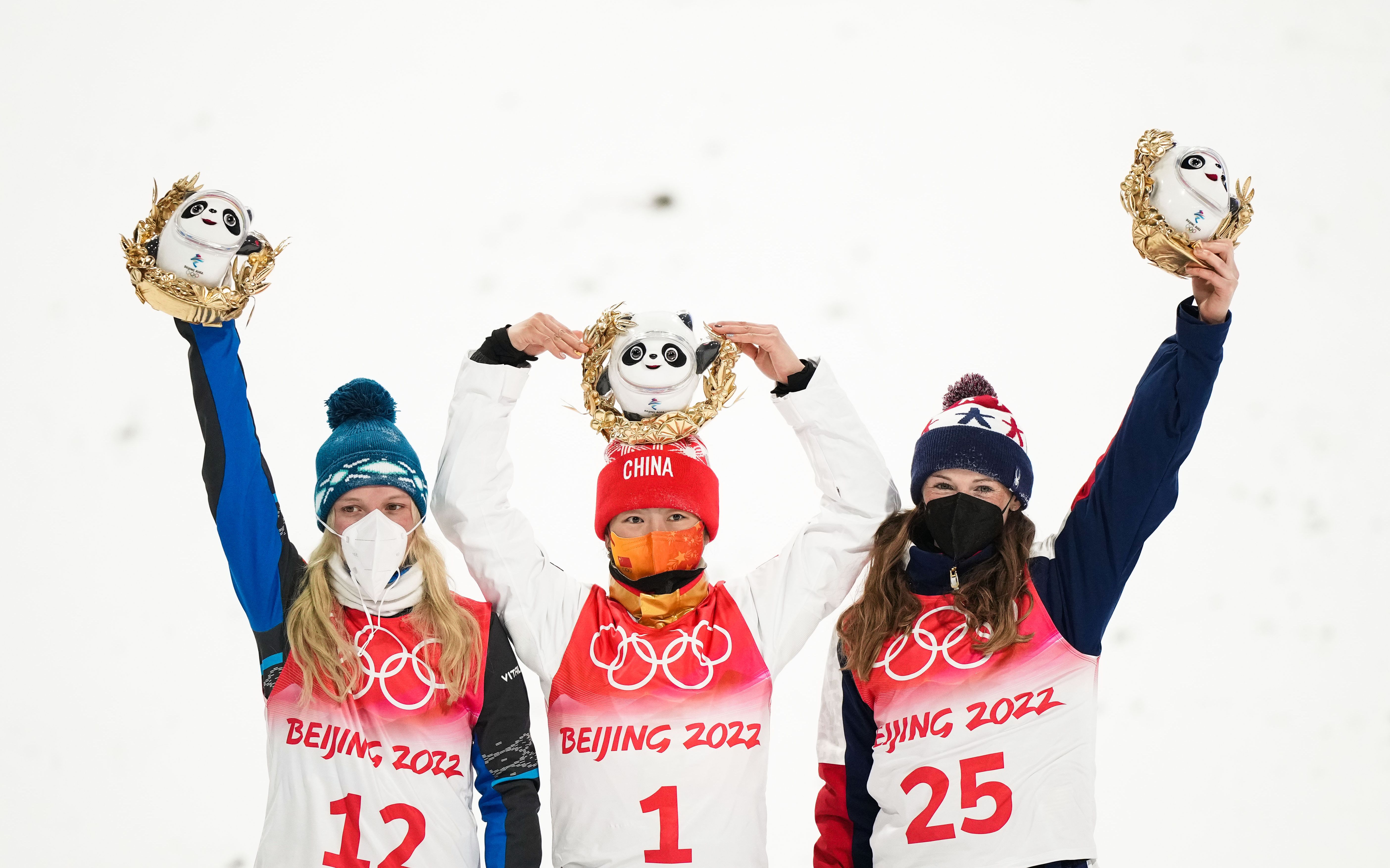 ▲徐梦桃和亚军、季军选手赛后合影。图/新华社