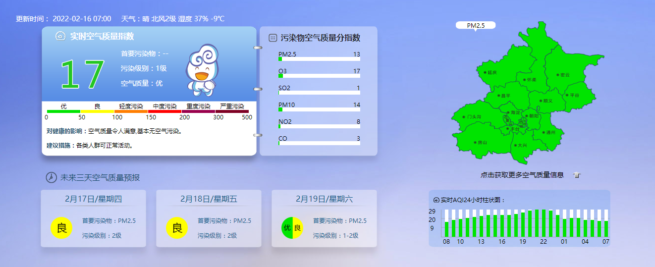 据北京市生态环境监测中心今早7时数据,目前实时空气质量指数17,污染级别1级,空气质量优。
