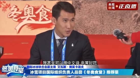 国际冰球联合会副主席艾瓦斯·奥莫卡诺夫曾在北京大学读过书,中文水平了得,甚至在现场做起了翻译,并用中文称赞中国美食“非常好吃”。