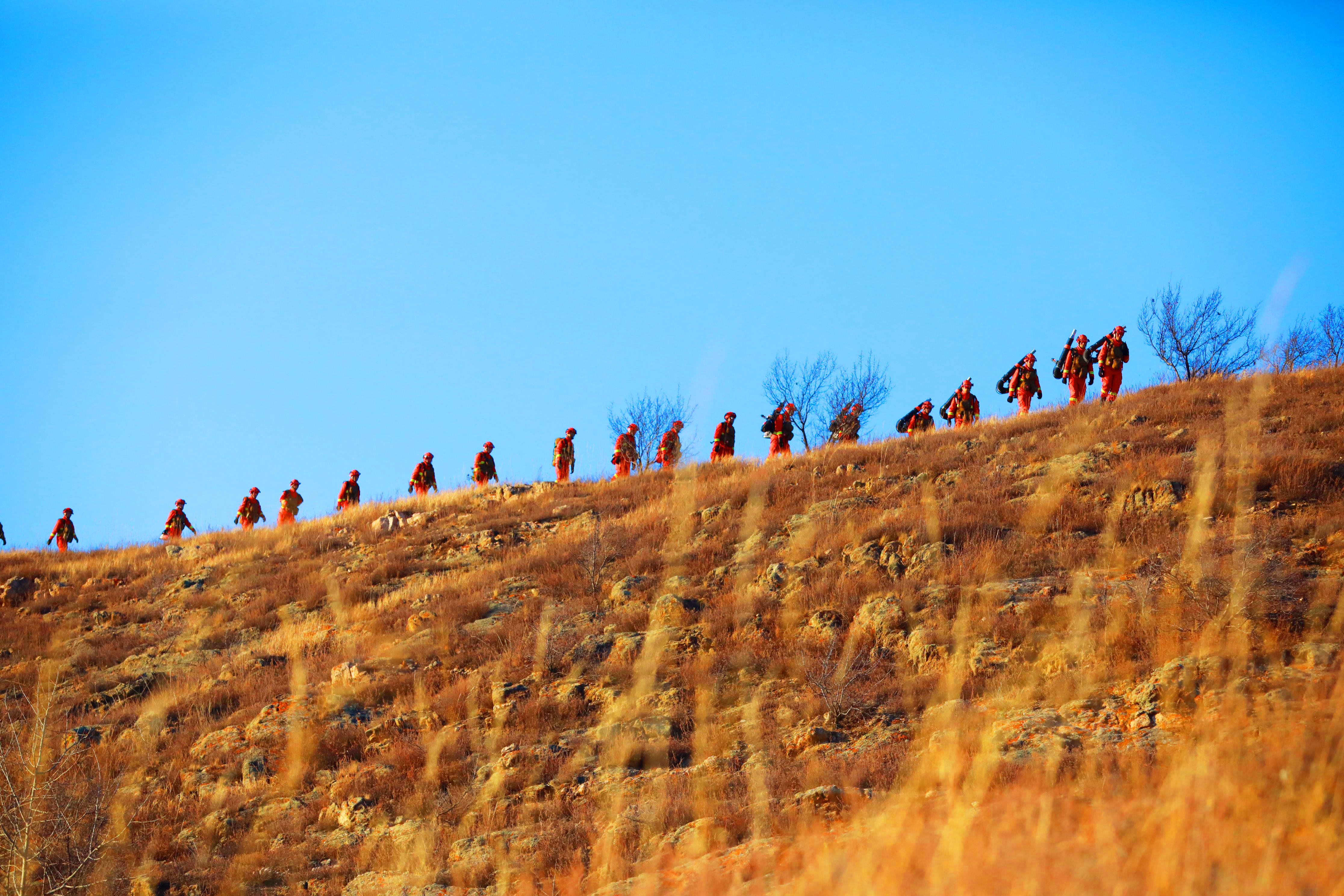 佳木斯市森林消防支队在崇礼区的崇山峻岭中跋涉。受访者供图