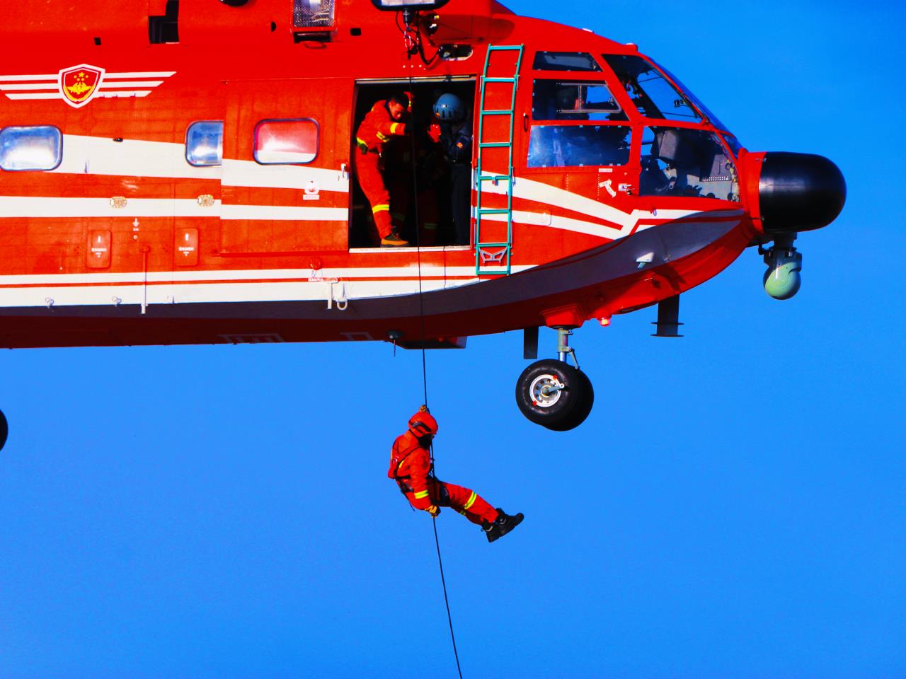 佳木斯市森林消防支队正在开展直升机索滑降训练。受访者供图