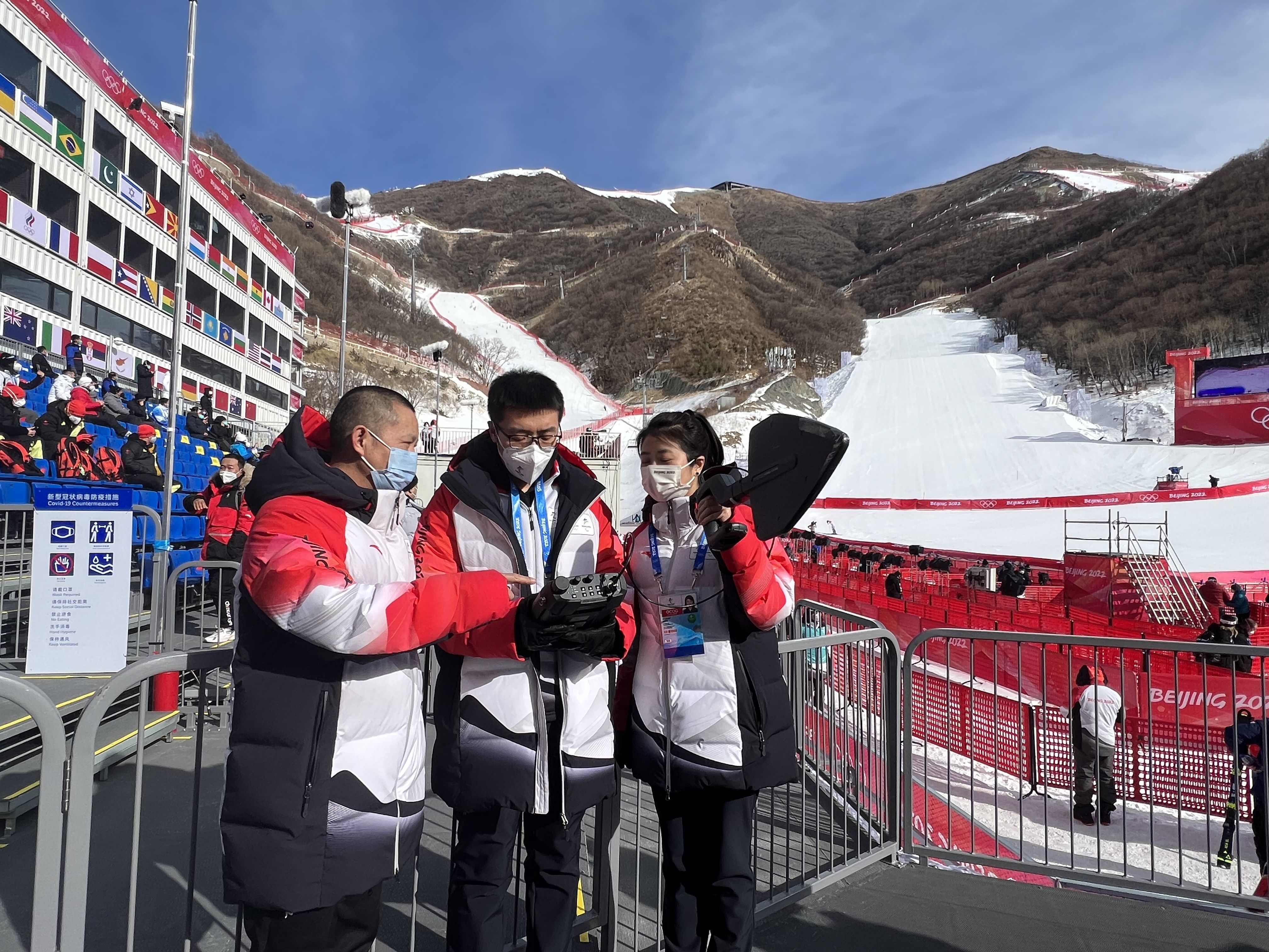 国家高山滑雪中心,无线电频率主管邹明(中)正与同事对OMEGA计时记分系统开展保护性监测。受访者供图