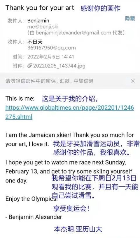 “我是牙买加滑雪运动员,非常感谢你的作品,我很喜欢,希望你能在下周日2月13日观看我的比赛,并且有一天能自己尝试滑雪。”这是本杰明写给侯加齐的第一封信。