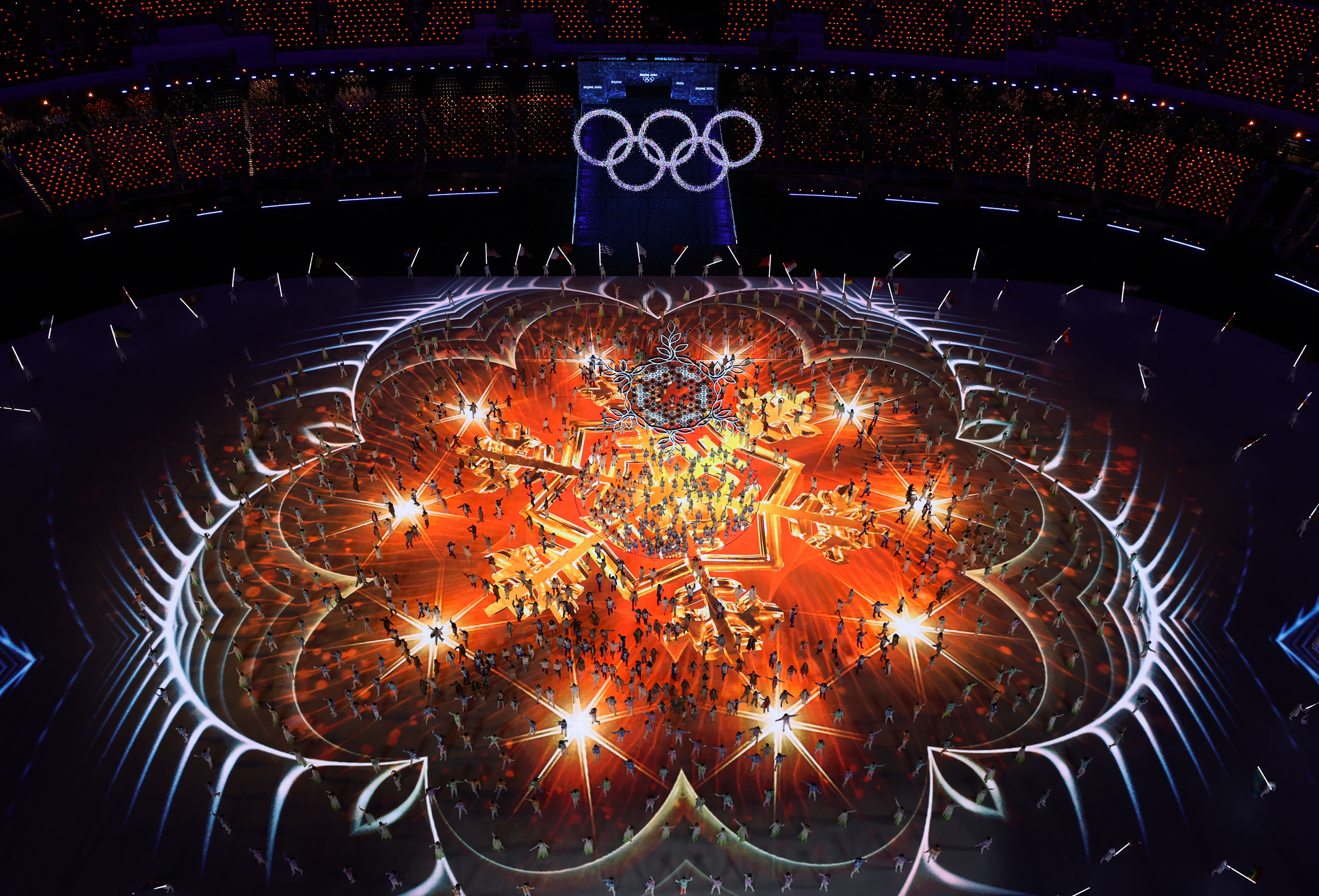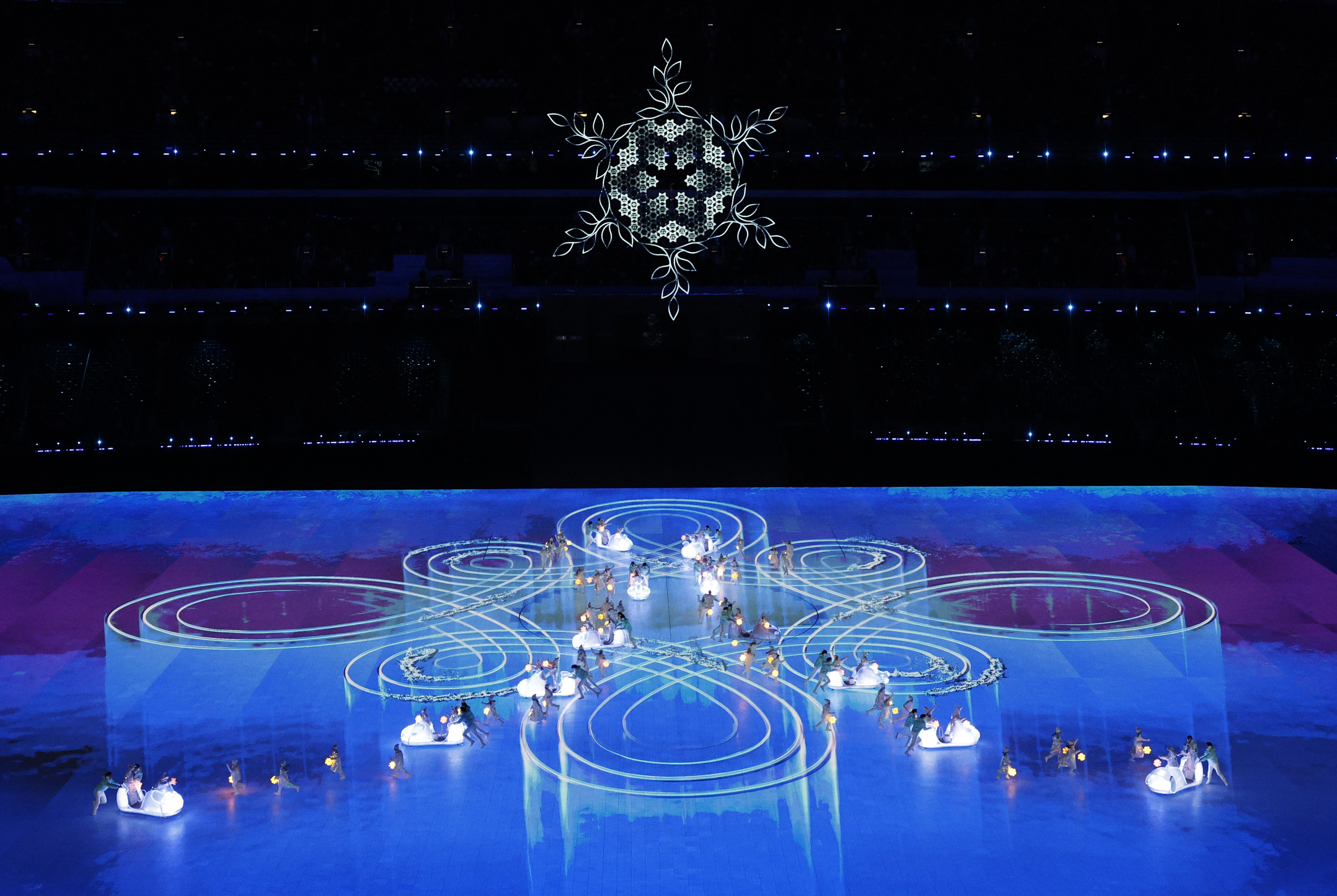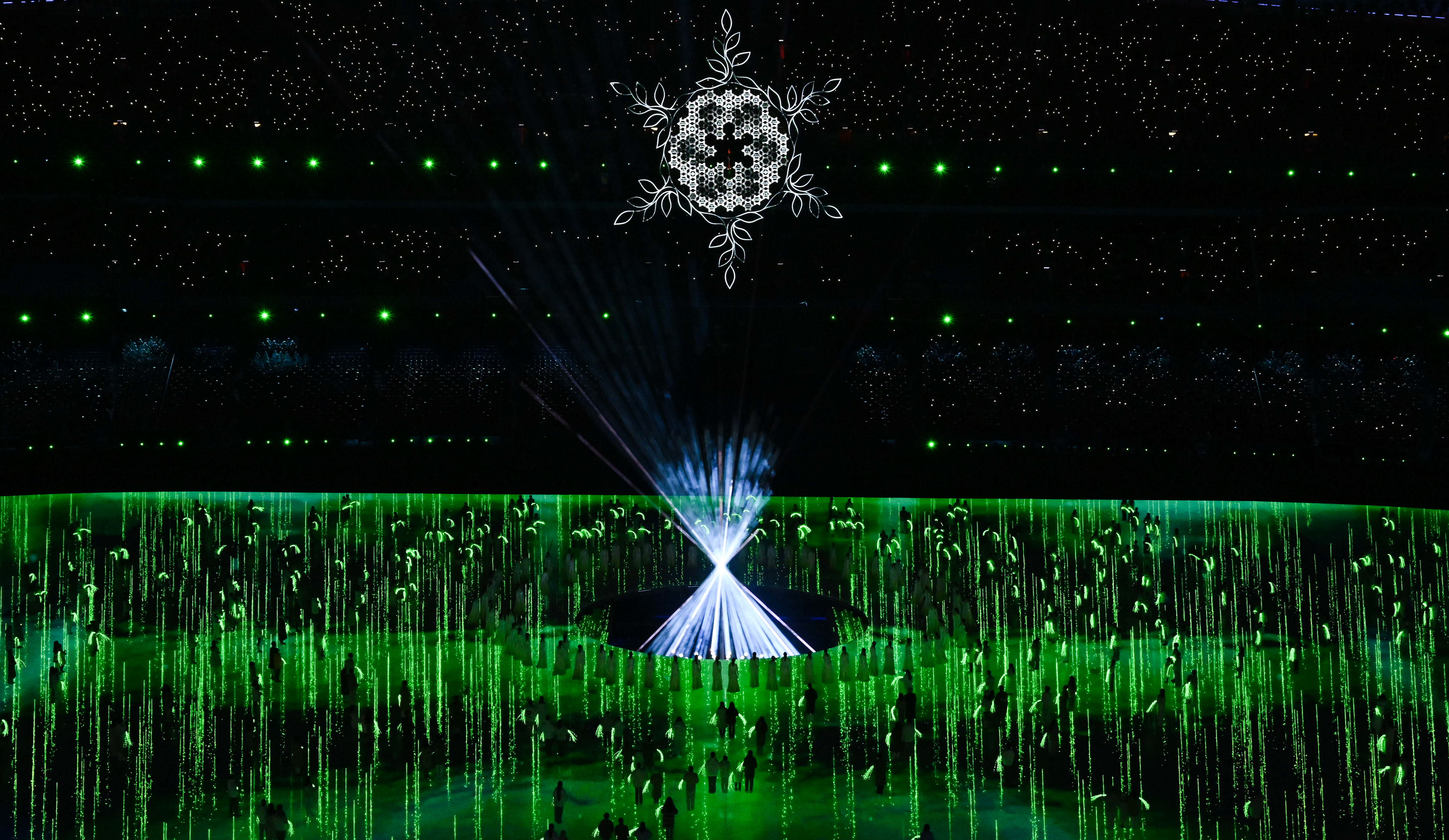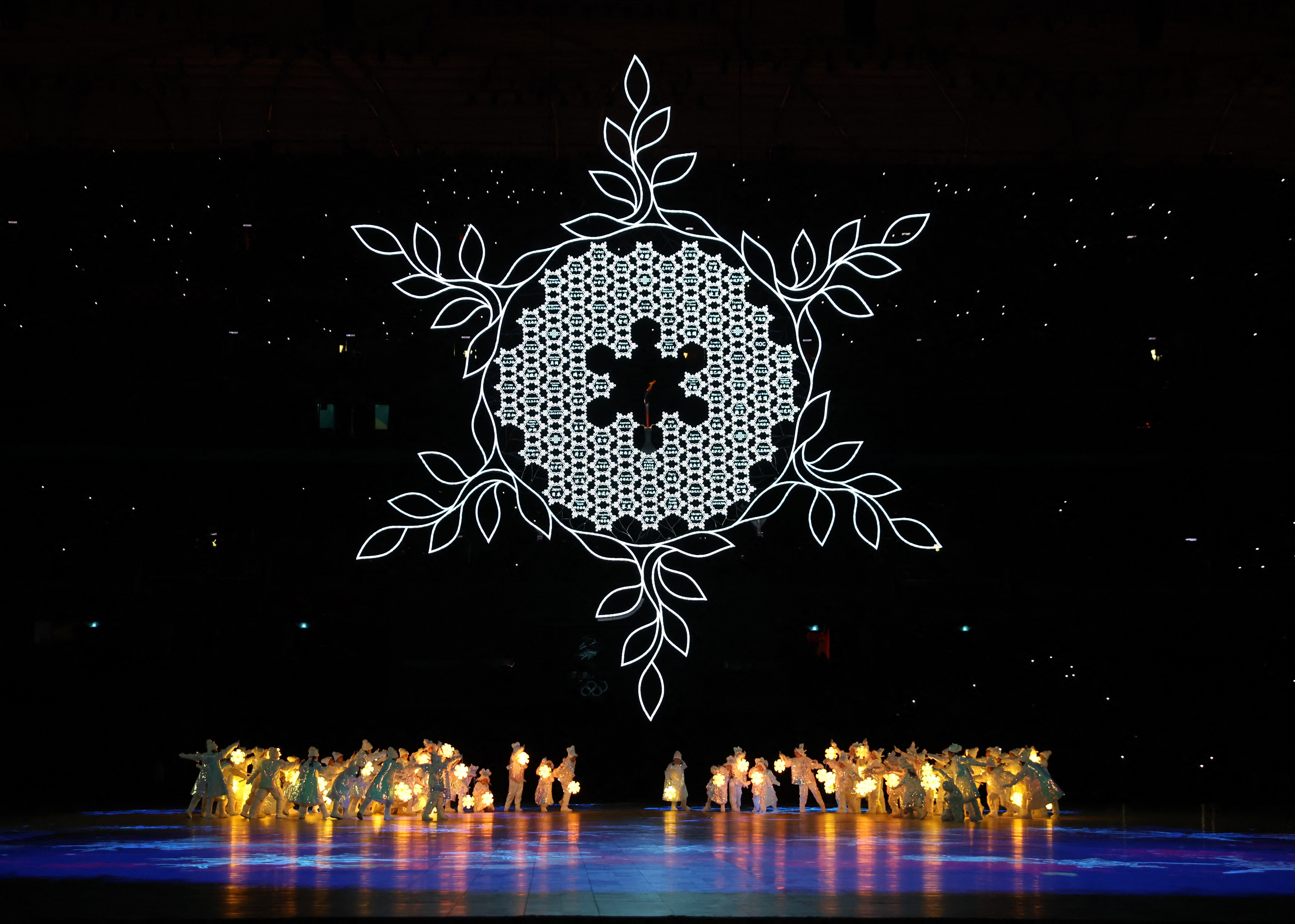 开幕式的时候,写有各个代表团名字的雪花引导牌汇聚起来,共同汇成一朵大雪花,这朵大雪花就是我们的主火炬台。当告别的时刻来到的时候,这永恒的微火,伴随着雪花飘散开来,将奥林匹克精神和中国人民的友谊送到世界各个角落。