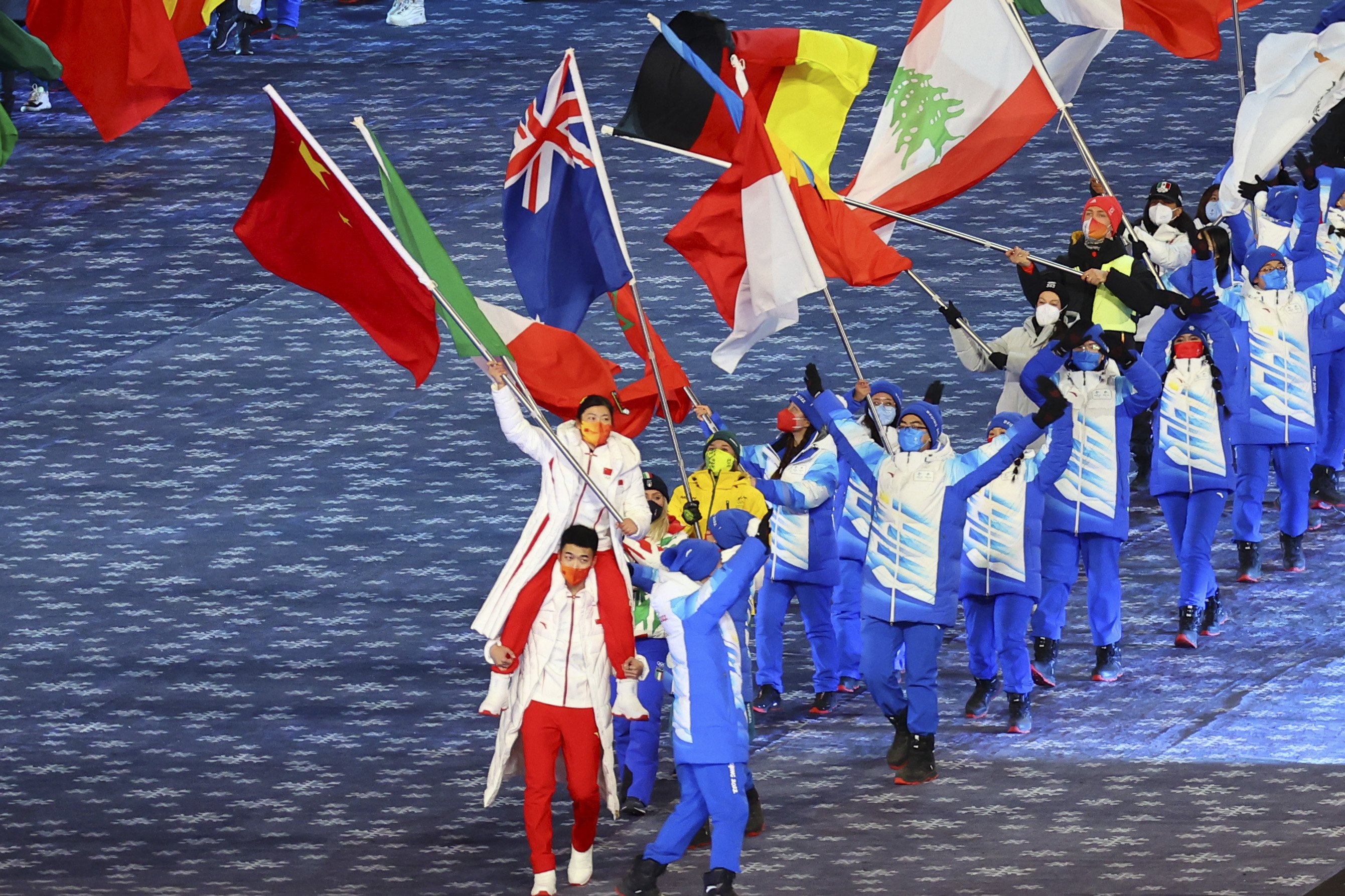 2022北京冬奥会闭幕式,中国代表团入场,旗手高亭宇、徐梦桃共同擎旗入场。
