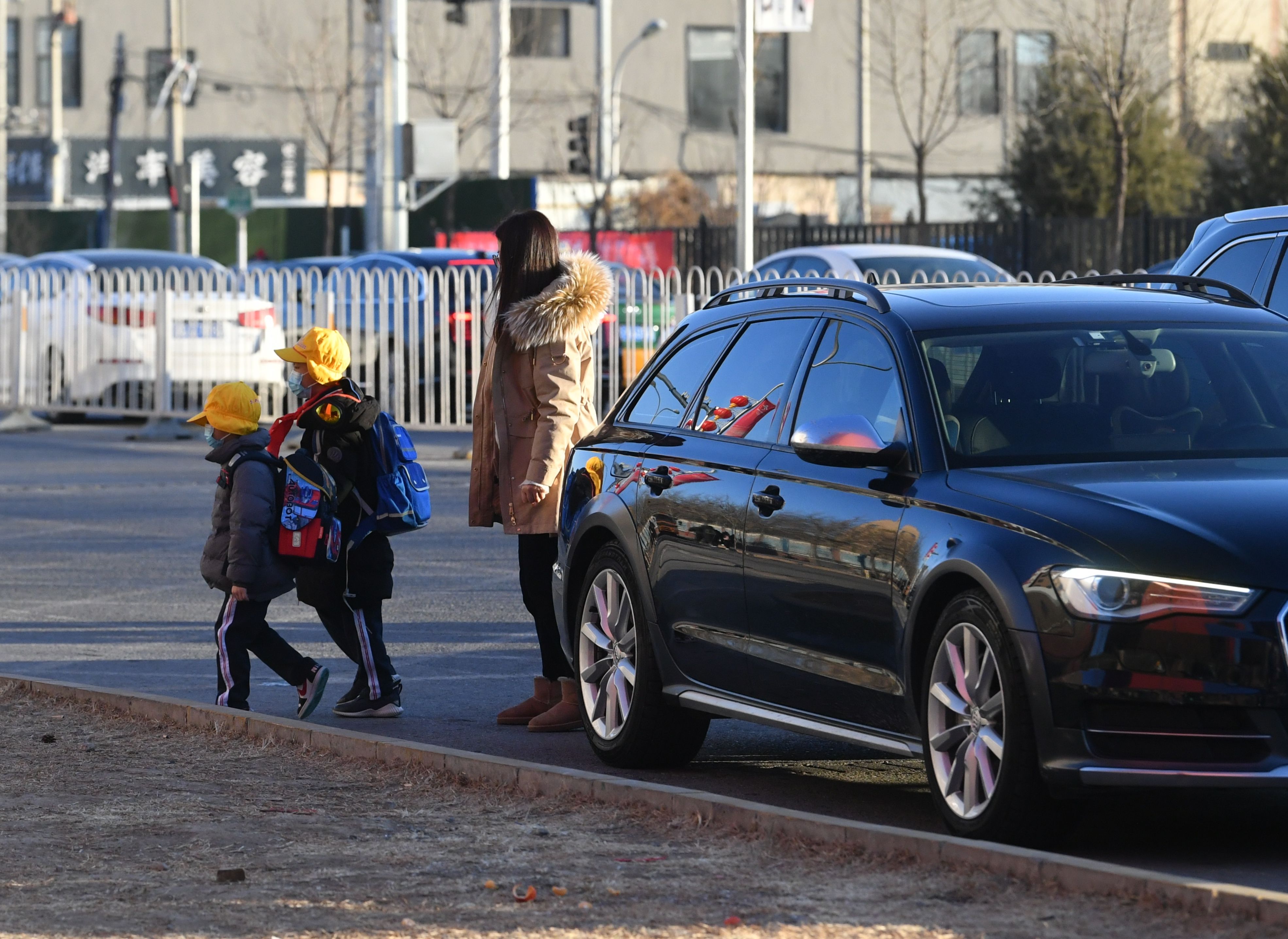陈经纶中学崇实分校小学部,家长开车送孩子上学。新京报记者 王贵彬 摄