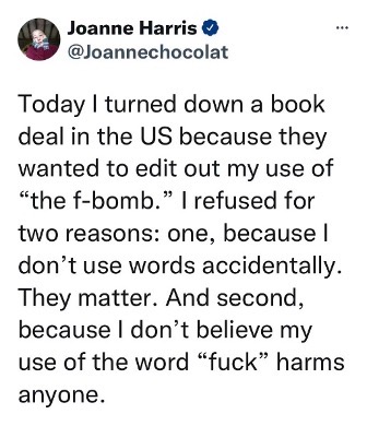 https://www.theguardian.com/books/2022/feb/19/author-joanne-harris-turns-down-us-book-deal-over-censoring-of-f-bomb