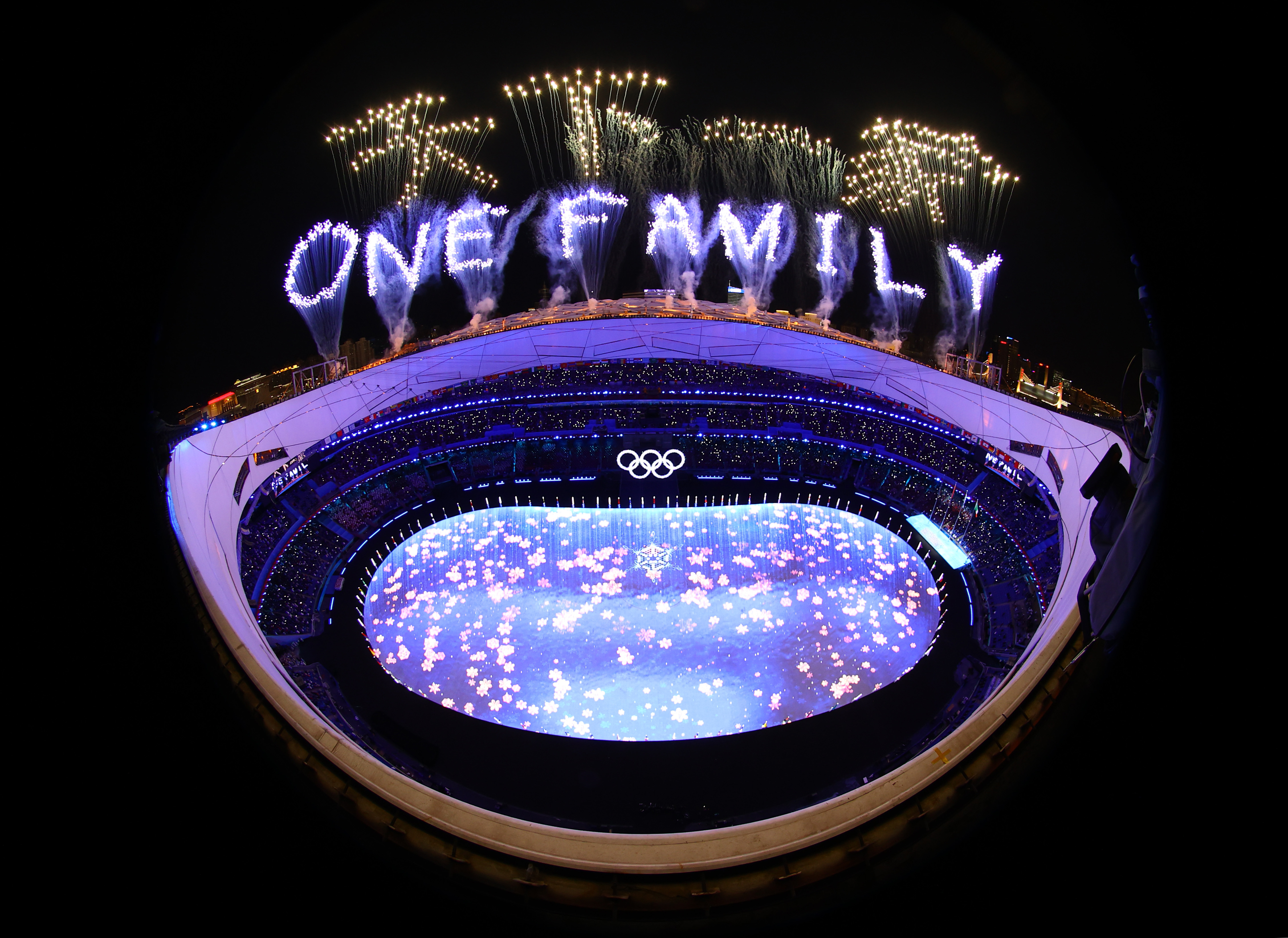 作为本次闭幕式焰火环节的重磅,“one world one family”效果宽度有320-400米。“彩色拉手”“彩色环”“双环”以及“响椰树”“锦冠飞龙”等图像,也在“鸟巢”上空“跑动”成一个个熠熠夺目的光环。