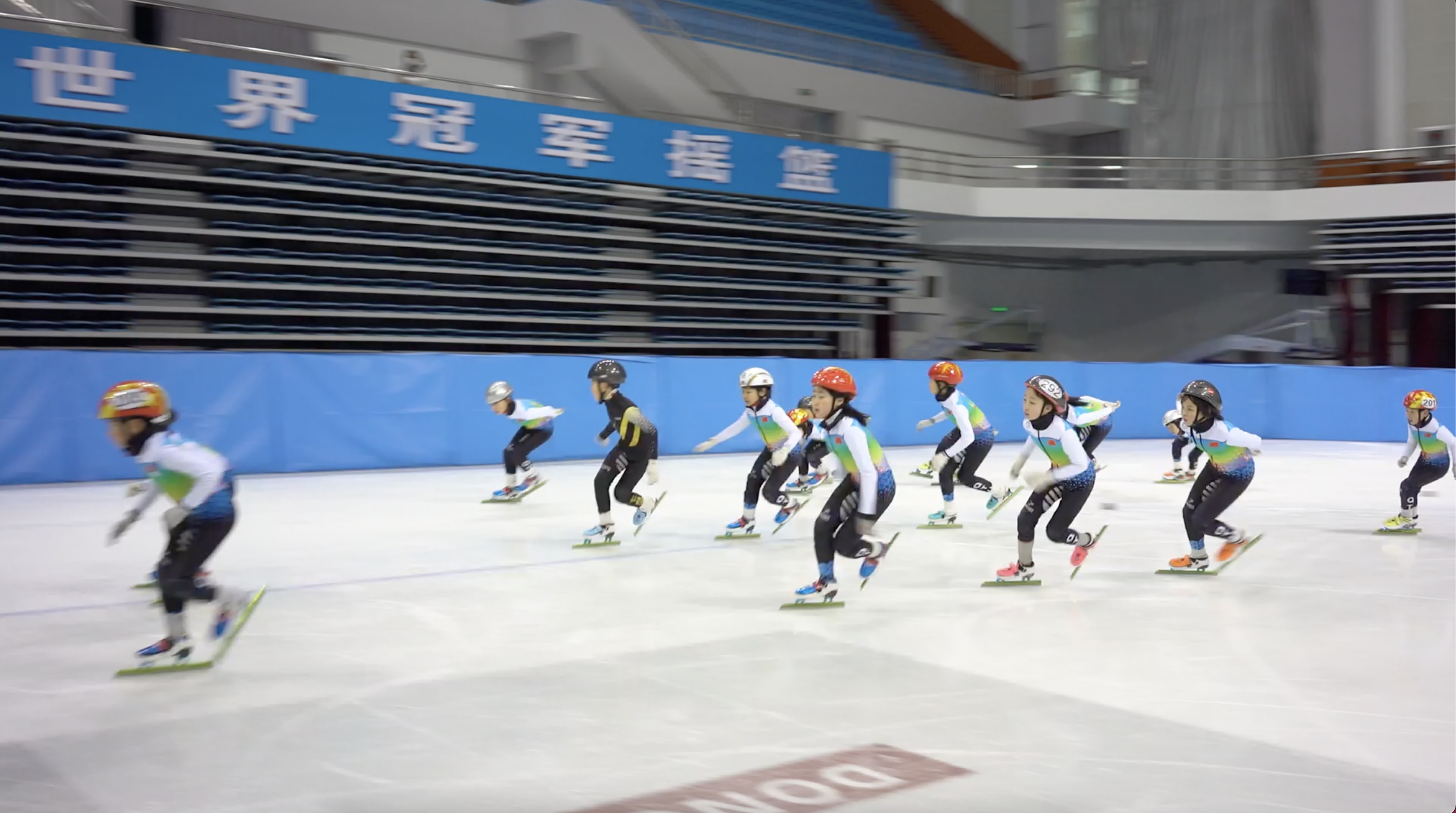 四个孩子压低身子,左脚贴着起跑线,右脚微微倾斜——出发指令一响,蹬动冰刀,直到由奔跑变为滑行。另一些孩子在内圈,呼喊着队友名字。在接棒的一瞬,被队友推送,完成一圈接力。然后,是下一圈。