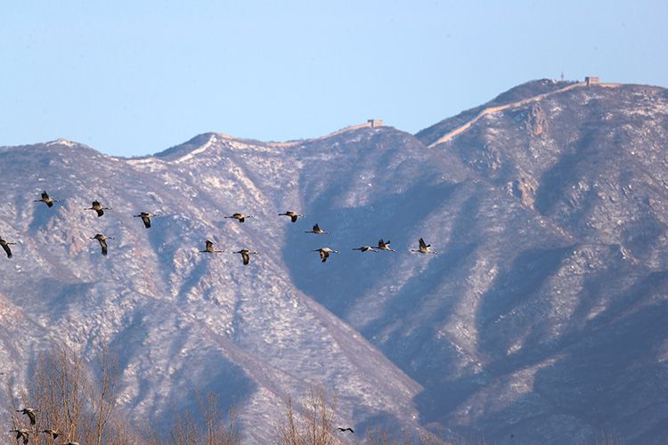 近日,北京黑豹野生动物保护站监测到,首批在南方越冬归来的候鸟陆续抵达北京官厅水库。首批北上抵达官厅水库的候鸟约7000只,且数量还将继续增加。图为:2月18日,一批灰鹤抵达官厅水库上空,远处是绵延的八达岭长城。