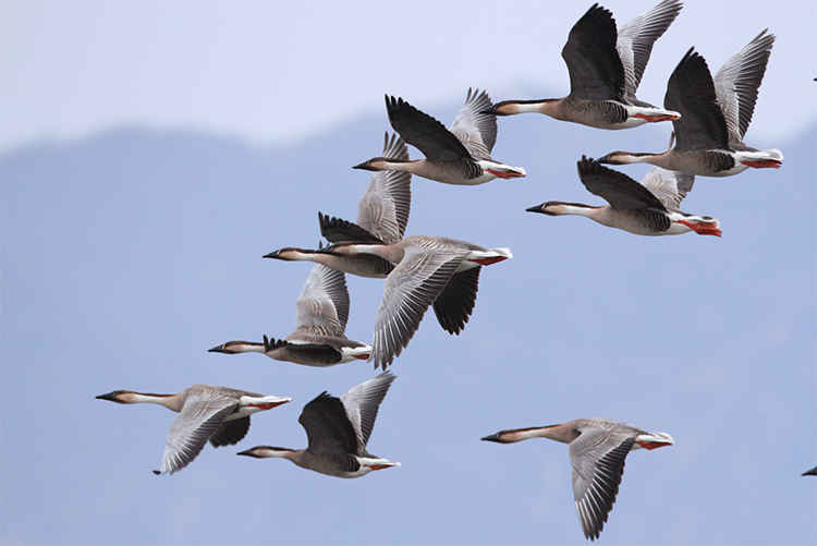 据黑豹野生动物保护站站长李理介绍,灰鹤类候鸟比较健壮,飞行速度较快,比其他雁鸭类候鸟提前到达北京。豆雁、鸿雁、赤麻鸭、针尾鸭等雁鸭类大批候鸟还在北上途中,估计三月中旬会进京。图为:2月18日,灰鹤群在空中盘旋,背景是小海坨山上国家高山滑雪中心的赛道。