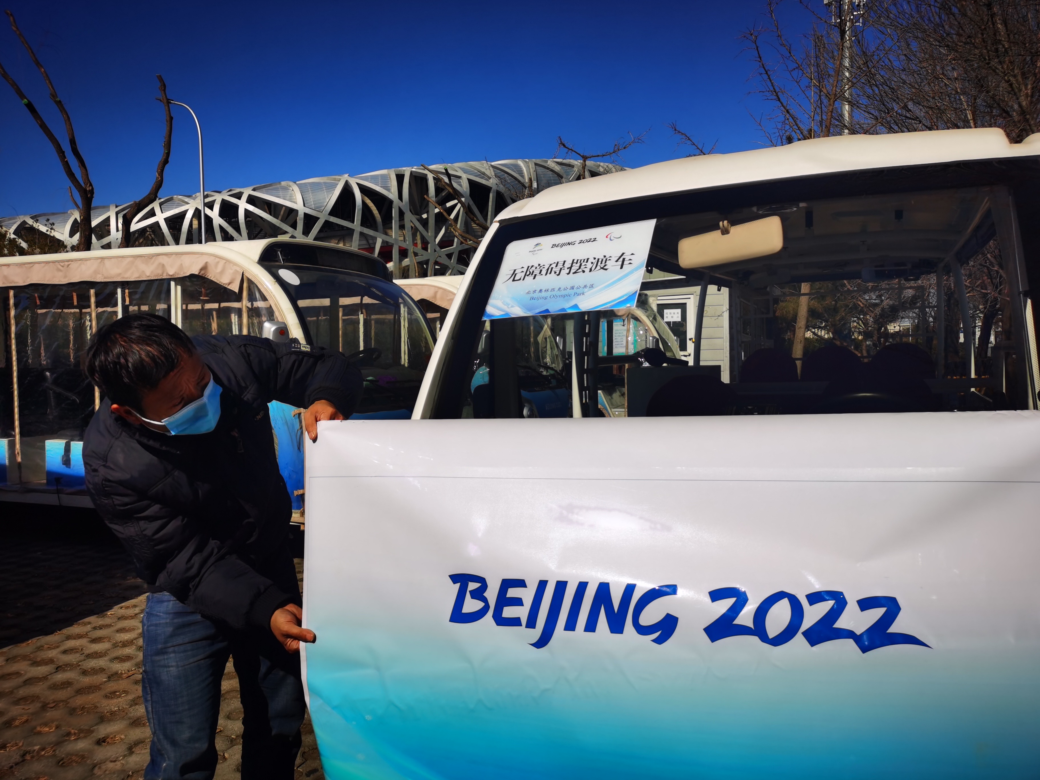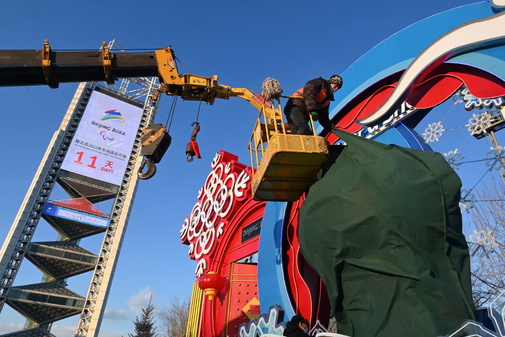 工作人员在奥林匹克公园公共区开展冬残奥会形象景观和引导标识的转换工作。通讯员 张正晔 摄
