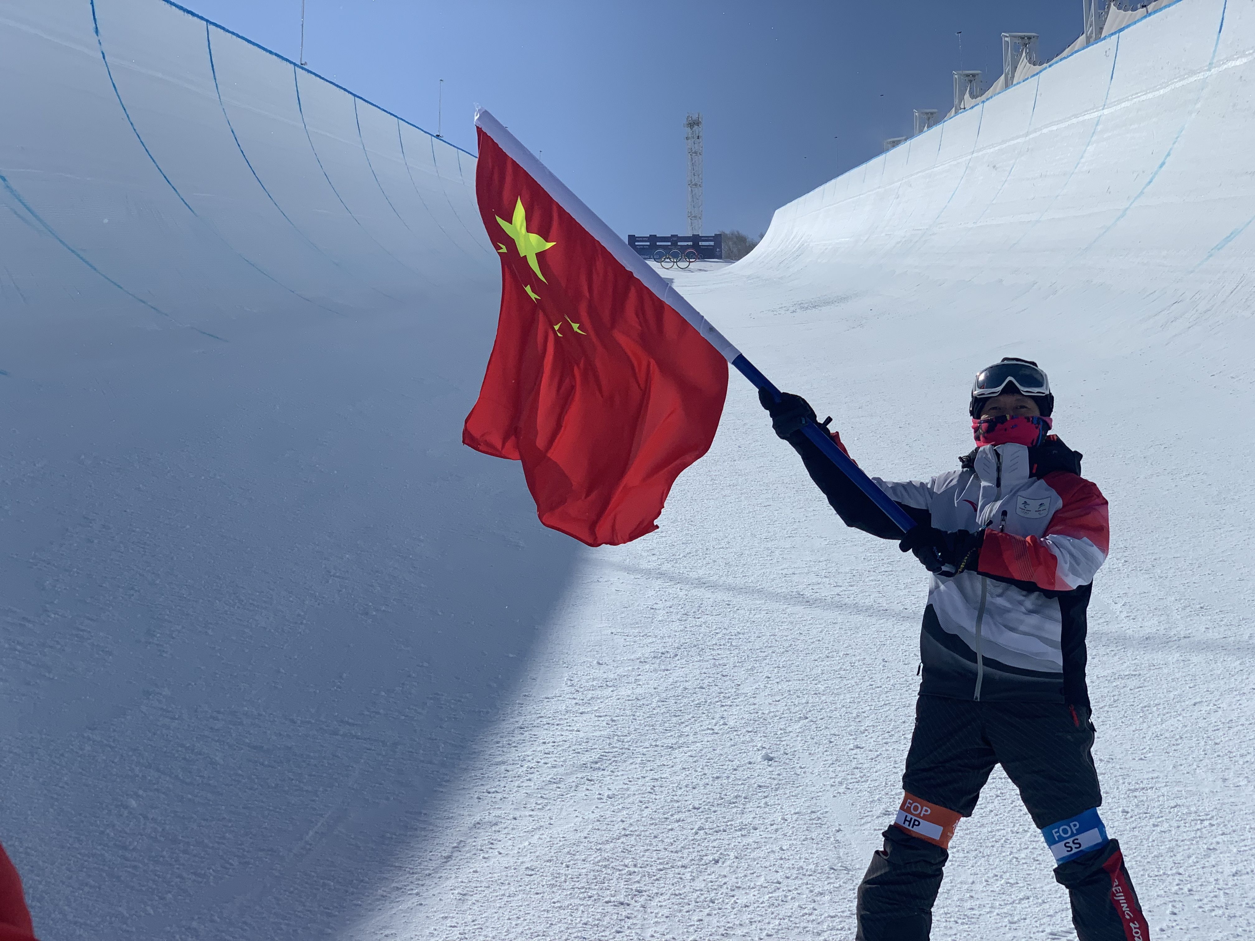 2022年2月18日,谷爱凌U型场地技巧决赛夺冠当天,刘鑫举红旗拍照片留念。受访者供图
