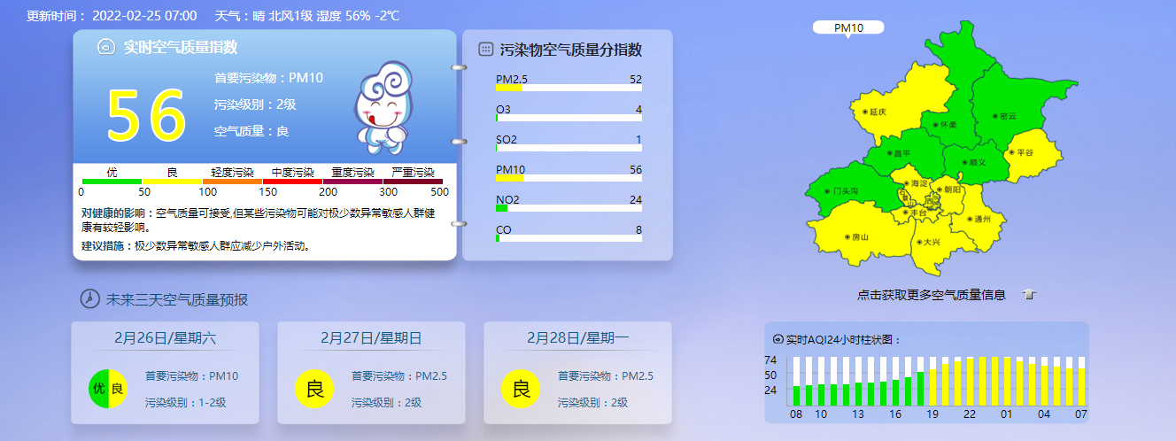 据北京市生态环境监测中心今早7时数据,目前实时空气质量指数56,空气质量良。
