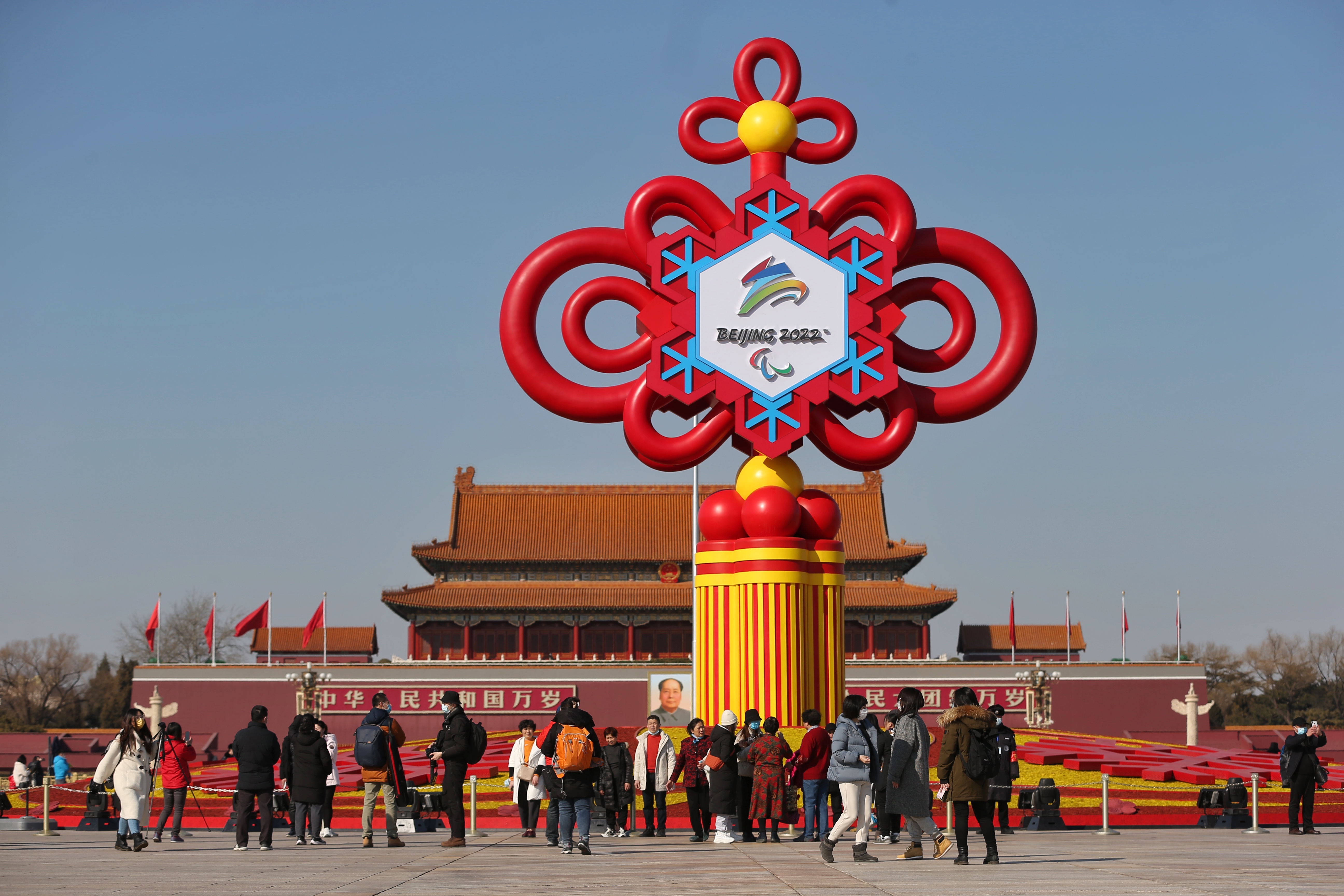 天安门广场“精彩冬奥”主题花坛中国结南北两面已经换上了冬残奥会会徽。新京报记者 薛珺 摄