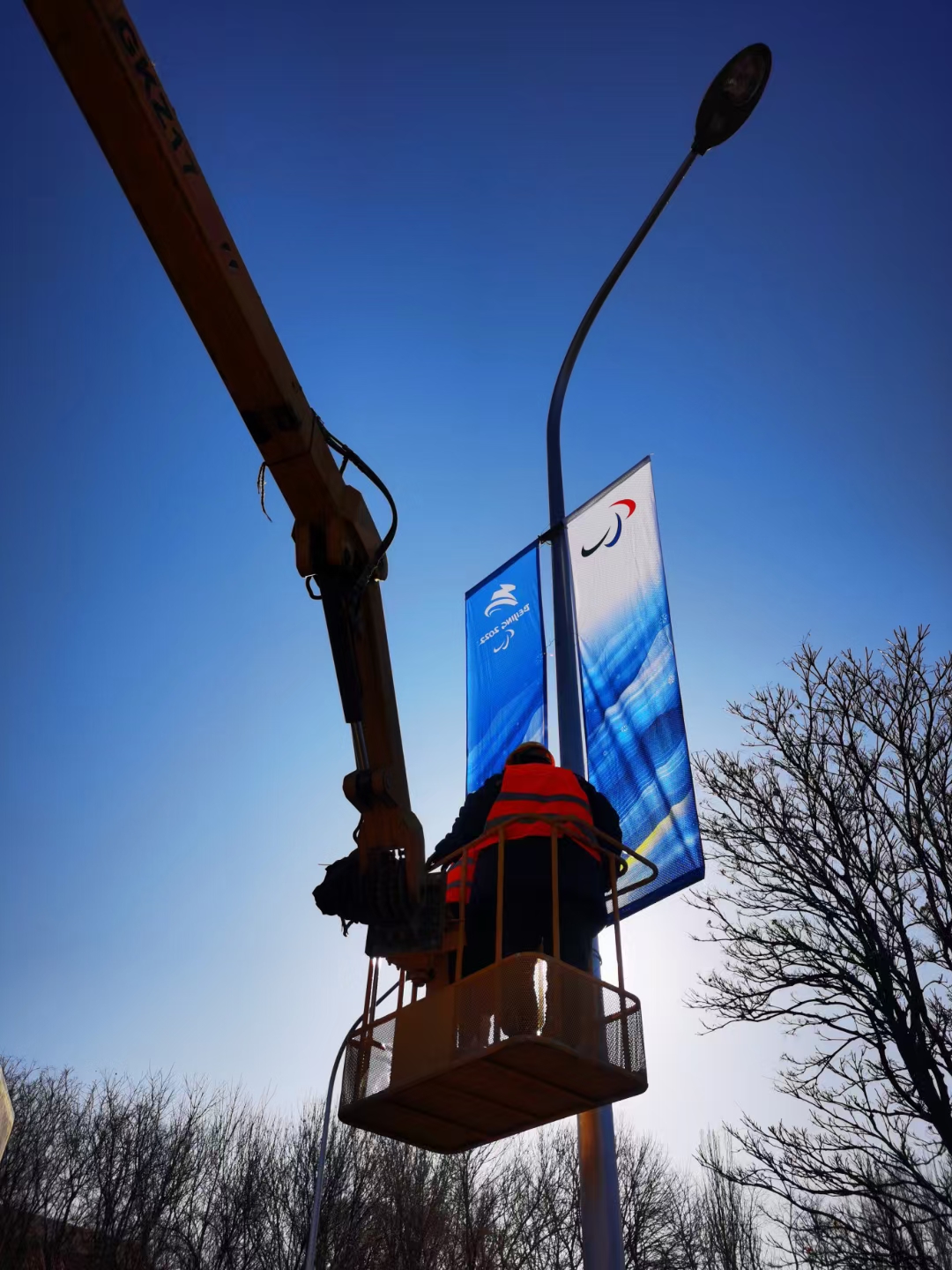 工作人员在奥林匹克公园公共区开展冬残奥会形象景观和引导标识的转换工作。通讯员 张正晔 摄