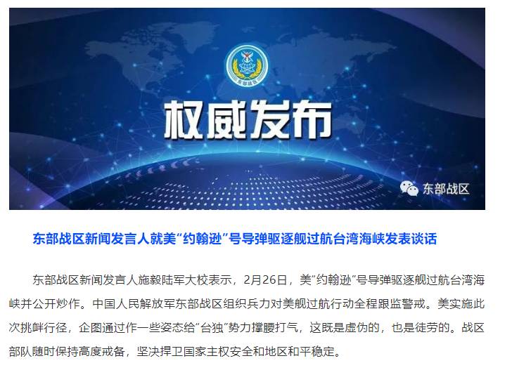 新京报快讯 据东部战区官方微信2月26日消息,东部战区新闻发言人就美“约翰逊”号导弹驱逐舰过航台湾海峡发表谈话。