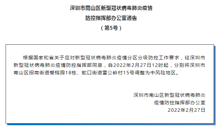 新京报快讯 据创新南山官微消息,根据国家和省关于应对新型冠状病毒肺炎疫情分区分级防控工作要求,经深圳市新型冠状病毒肺炎疫情防控指挥部同意,自2022年2月27日12时起,分别将深圳市南山区招商街道爱榕园18栋、蛇口街道雷公岭村15号调整为中风险地区。