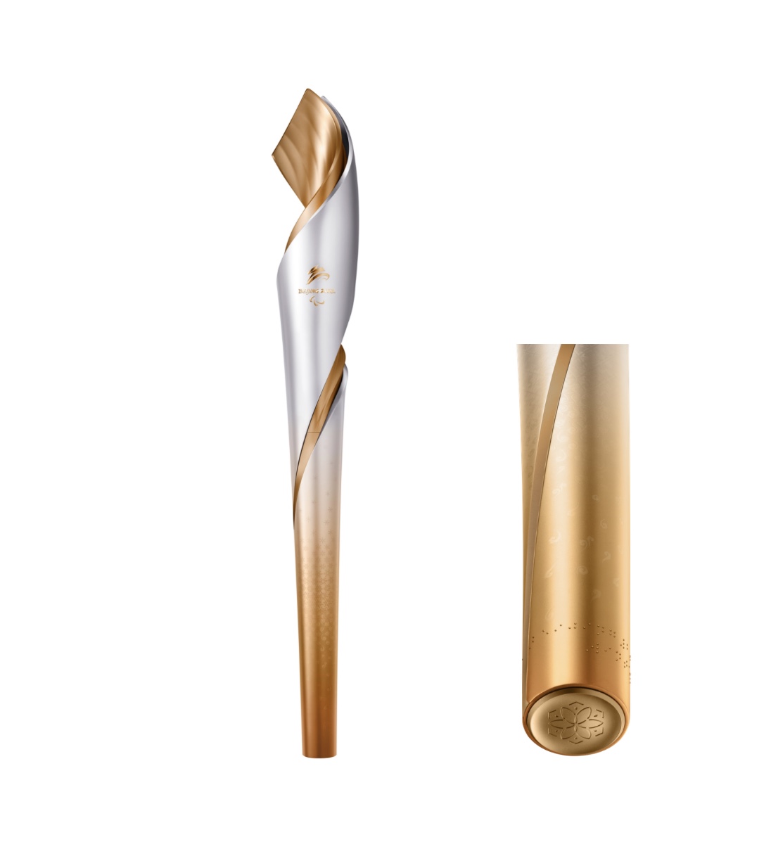 火炬“飞扬”外形极具动感和活力,颜色为银色与金色,寓意辉煌与梦想。金色线条随火炬转动而上下贯通,象征着激情的冰雪赛道,也代表着永恒的火种,表达了人类生生不息、包容融合、向往和平的期望和“勇气、决心、激励、平等”的残奥价值观。