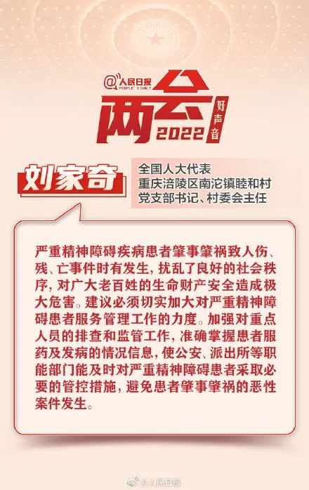 2022年全国“两会”即将召开。今年全国“两会”,全国人大代表、重庆涪陵区南沱镇睦和村党支部书记、村委会主任刘家奇将带着包括《关于加大对严重精神障碍患者服务管理工作力度的建议》在内的4个建议参会。他在建议中表示:“必须切实加大对严重精神障碍患者服务管理工作的力度,保护广大人民群众的安全,促进社会的安稳和谐。”