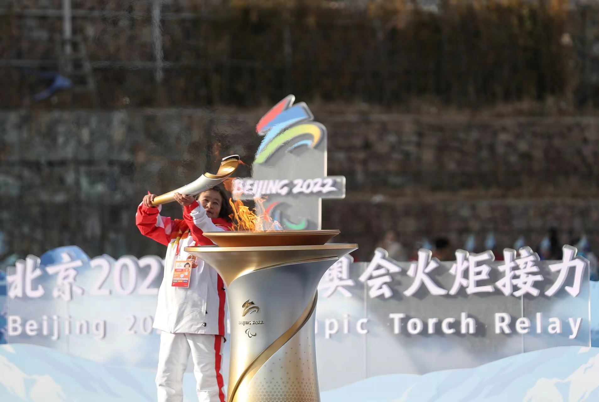 傅小云在传递冬残奥会火炬。新京报记者 李木易 摄