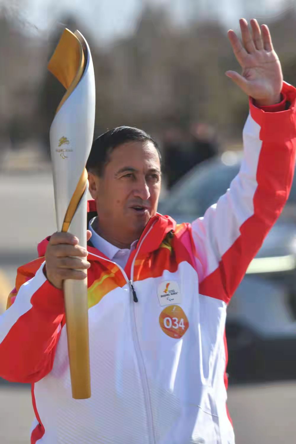 龙吉克•卡德尔正在传递冬残奥会火炬。受访者供图